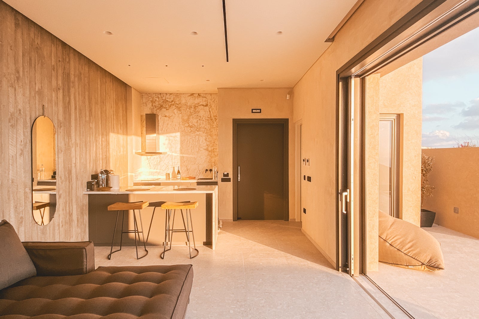 Think of your favorite luxury home design magazine mixed with some of your favorite hotel interiors — that's Santorini Sky.