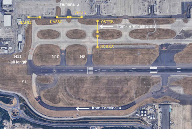 There are also five ground reporting points before reaching the runway -- HANLI, DASSO and VIKAS for aircraft coming from Terminal 5 and OSTER and HORKA for aircraft coming from the rest of the airfield.