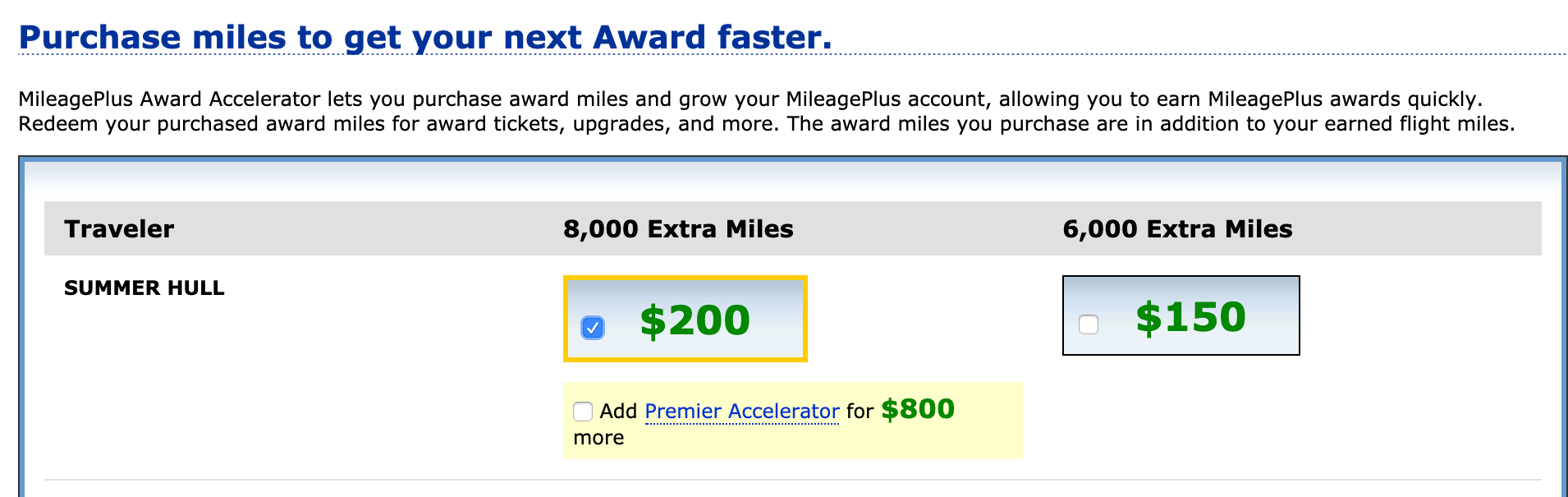 Buying the miles is a little tricky, as you need to have an active United reservation to make the purchase, and the price varies -- and typically only increases as the year draws to a close. To purchase miles that count toward elite status, you need to not only purchase redeemable miles but also add the pricey Premier Accelerator option. In this case, that option adds 10 cents per mile to the total purchase cost. You can certainly earn miles cheaper than that by actually flying on inexpensive tickets. In the recent TPG mileage run competition, elite qualifying miles were earned for around 3 cents each, but the trade-off is the convenience of just hitting purchase from your comfy couch.