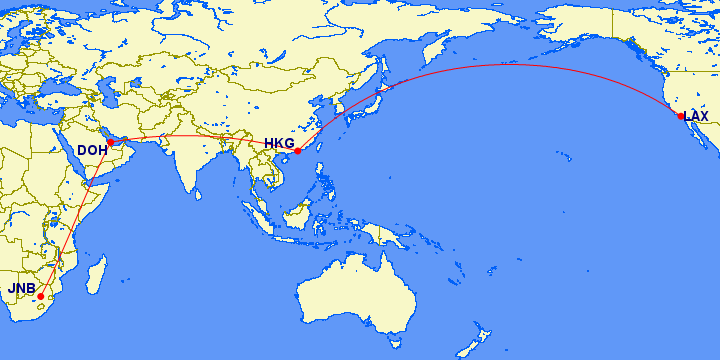 - Travel from North America to Europe, Africa and the Middle East must route via the Atlantic. You could fly from Los Angeles to London-Heathrow to Johannesburg (JNB), but you couldn't fly from Los Angeles to Hong Kong to Johannesburg instead.