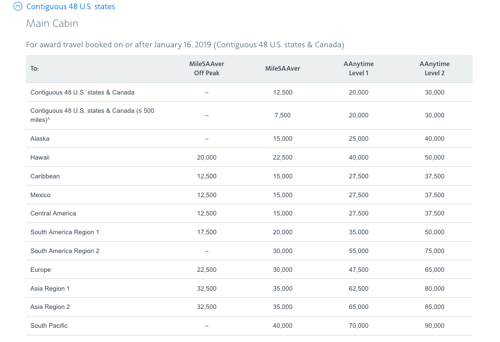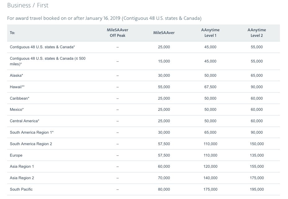 American also offers cheaper off-peak awards for economy travel to certain regions at certain times of year. Here are the regions to which they apply (dates are for 2019).