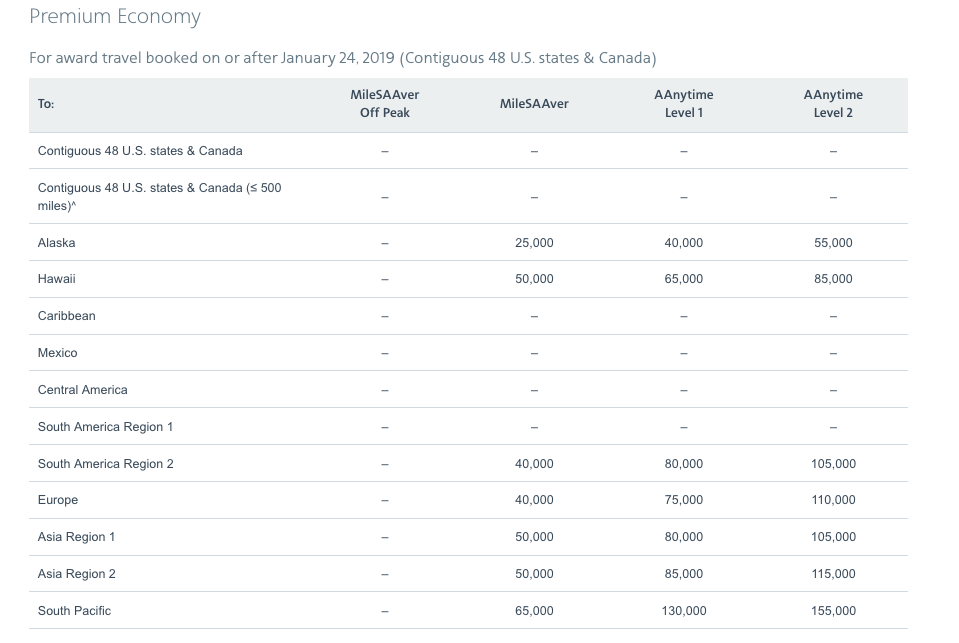 As you can see, there are several levels for each region depending on award availability and peak versus off-peak seasons. Here's the new premium-economy award chart for American-operated flights.