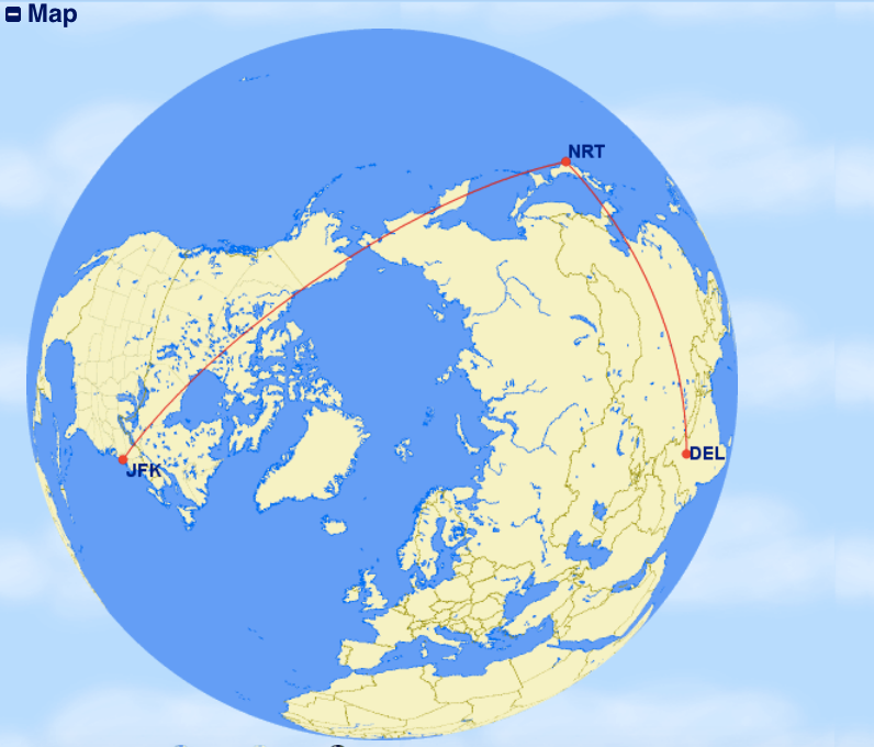The mileage works, clocking in at just 10,423 miles. Remember, though, you can't transit from North America to India via Asia 1, which includes Japan. Even though the itinerary does satisfy the MPM rule, it violates American's third-region transit rule, so this is an illegal routing for a single award ticket through the AAdvantage program.