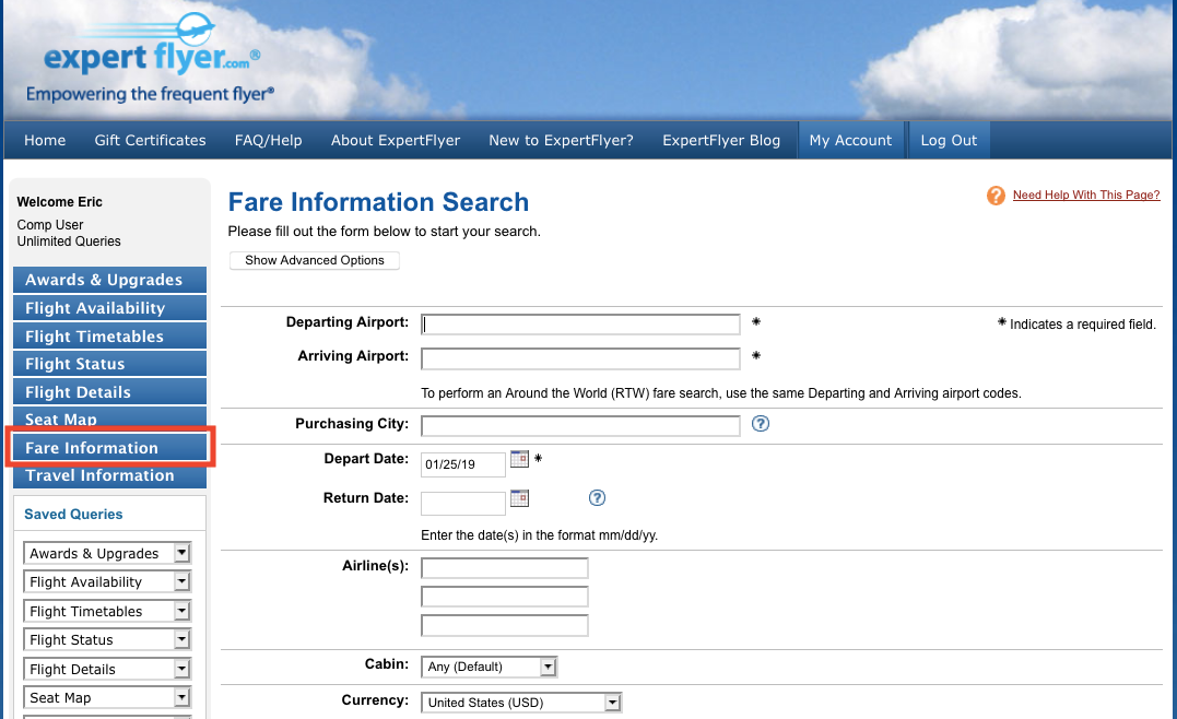Now for another esoteric consideration: any award you hope to book must be on a route where the transoceanic carrier publishes a fare. Just because tickets between certain cities don't show up on search engines does not mean there is not a published fare on that route. Rather, airlines have lists of published fares between city pairs that should be available for purchase by anyone. But to make things easier, log back into ExpertFlyer. Then use the Fare Information option to search city pairs and airlines for the dates you're curious about.