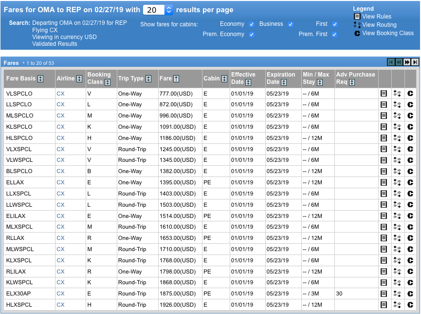 As an example, let's say you wanted to use your miles to fly to Asia and visit Angkor Wat in Cambodia. I put in a search example of Omaha (OMA) to Siem Ream (REP), with Cathay Pacific as the carrier.