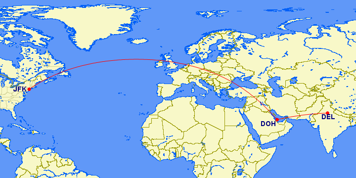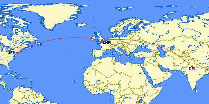Via the Atlantic, the MPM plus 25% is 11,928 miles. So flying from New York-JFK to London-Heathrow to New Delhi would definitely work since that route would be just 7,641 miles.