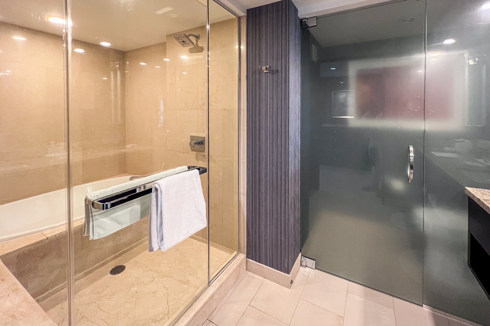 There was a large soaking tub and shower (Aria uses KiNU products) behind a glass door. I always find these layouts a little pointless because you end up getting the tub wet for no reason when you take a shower. A grip pad on the shower floor would also have been nice, as I was always extra cautious trying not to slip while rinsing off. There's a separate water closet behind a frosted glass door.