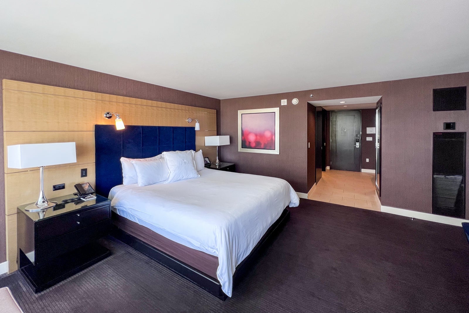 The room featured a comfy king-size bed and blackout shades that were controlled by a wall-mounted switch (curiously, they could be closed from a nightstand switch but only opened from one out-of-bedside reach in the guest room foyer).
