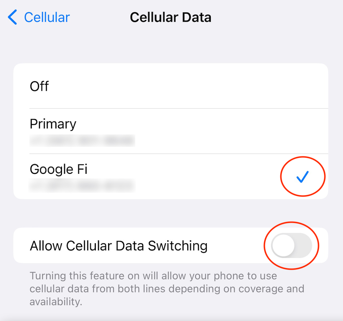 From there, you'll want to change the primary cellular data line to your international provider and turn off cellular data switching.