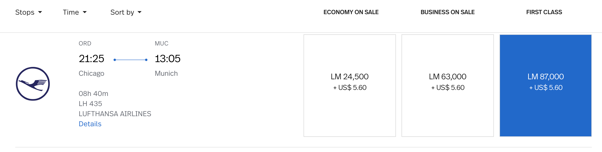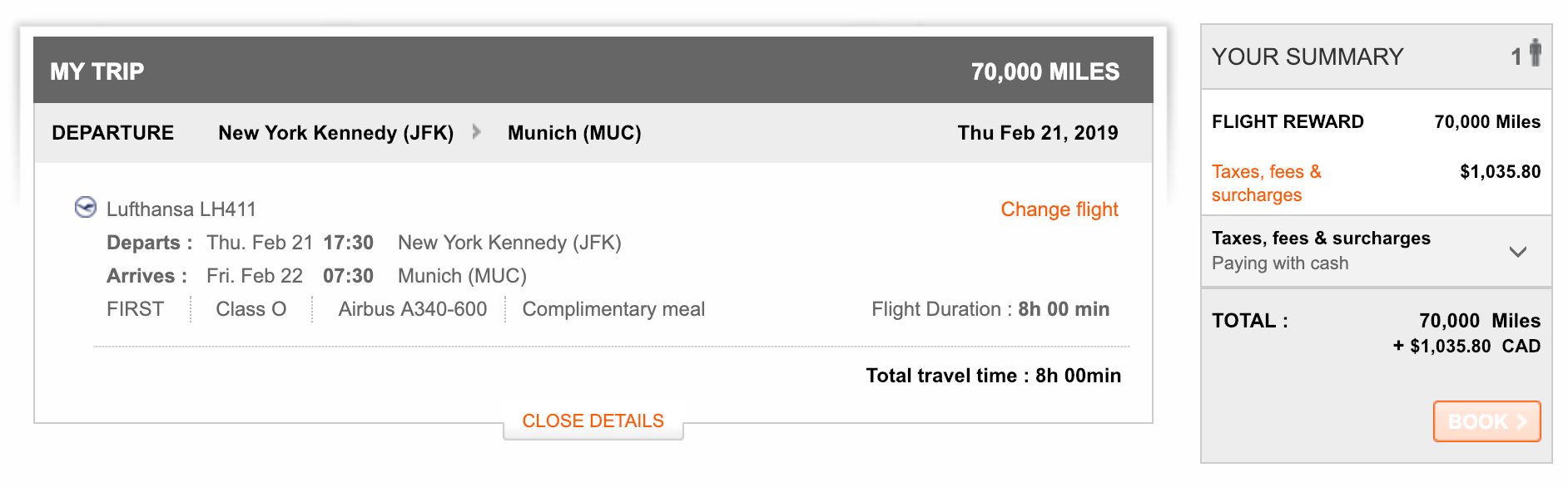 A prime example of this is Lufthansa first class, one of the best possible ways to travel between the U.S. and Europe. The cheapest way for most people to book this ticket from a pure miles perspective is through Aeroplan, which charges 70,000 miles, worth $1,050 based on TPG's valuations. However when you get to the checkout page you'll see that there's also about ~$785 in taxes, nearly doubling your cost.