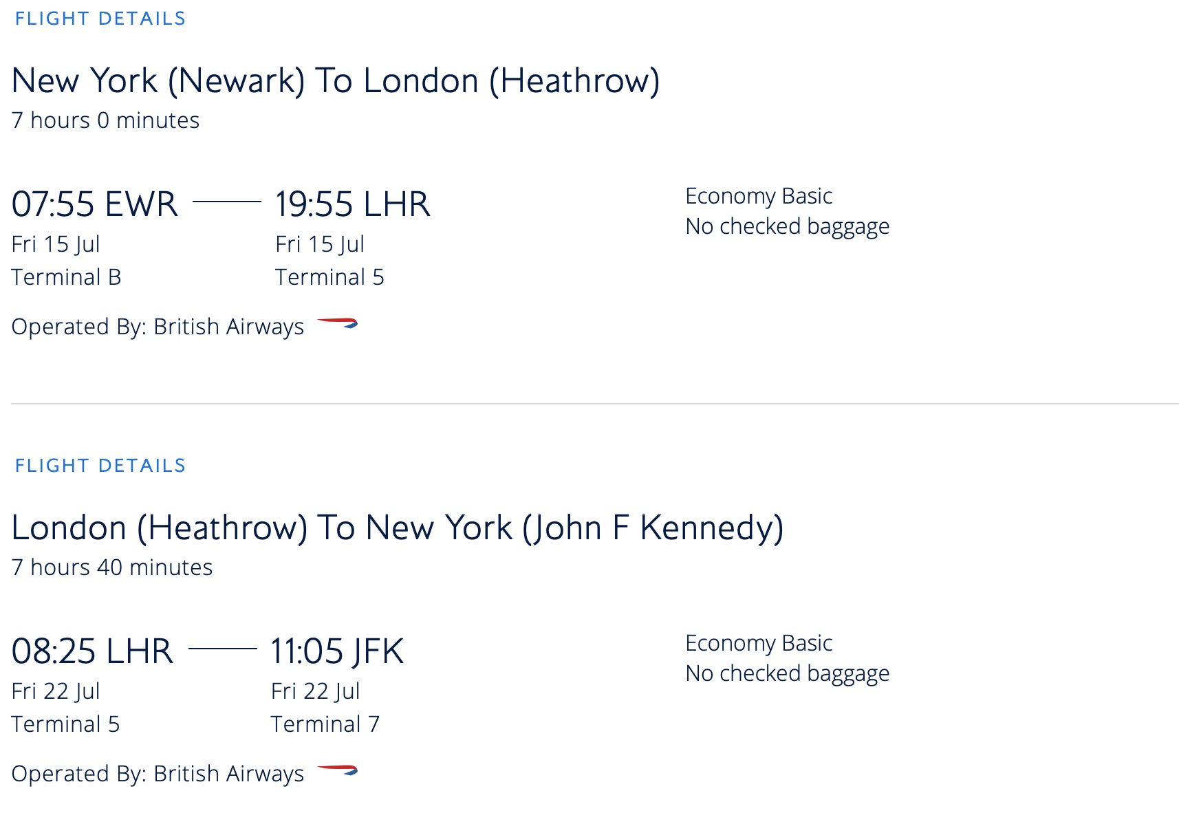 The table above shows the breakdown of Avios and Tier Points for BA's different fare classes. For example with the lowest economy classes (G, O and Q) you'll earn 25% of the miles flown and 25% of the Tier Points. A mid-range fare, such as this example roundtrip itinerary from Newark (EWR) to London (LHR), will earn you half of the miles flown. In this case, since it's an L class Basic Economy, you would earn 3,458 Avios.