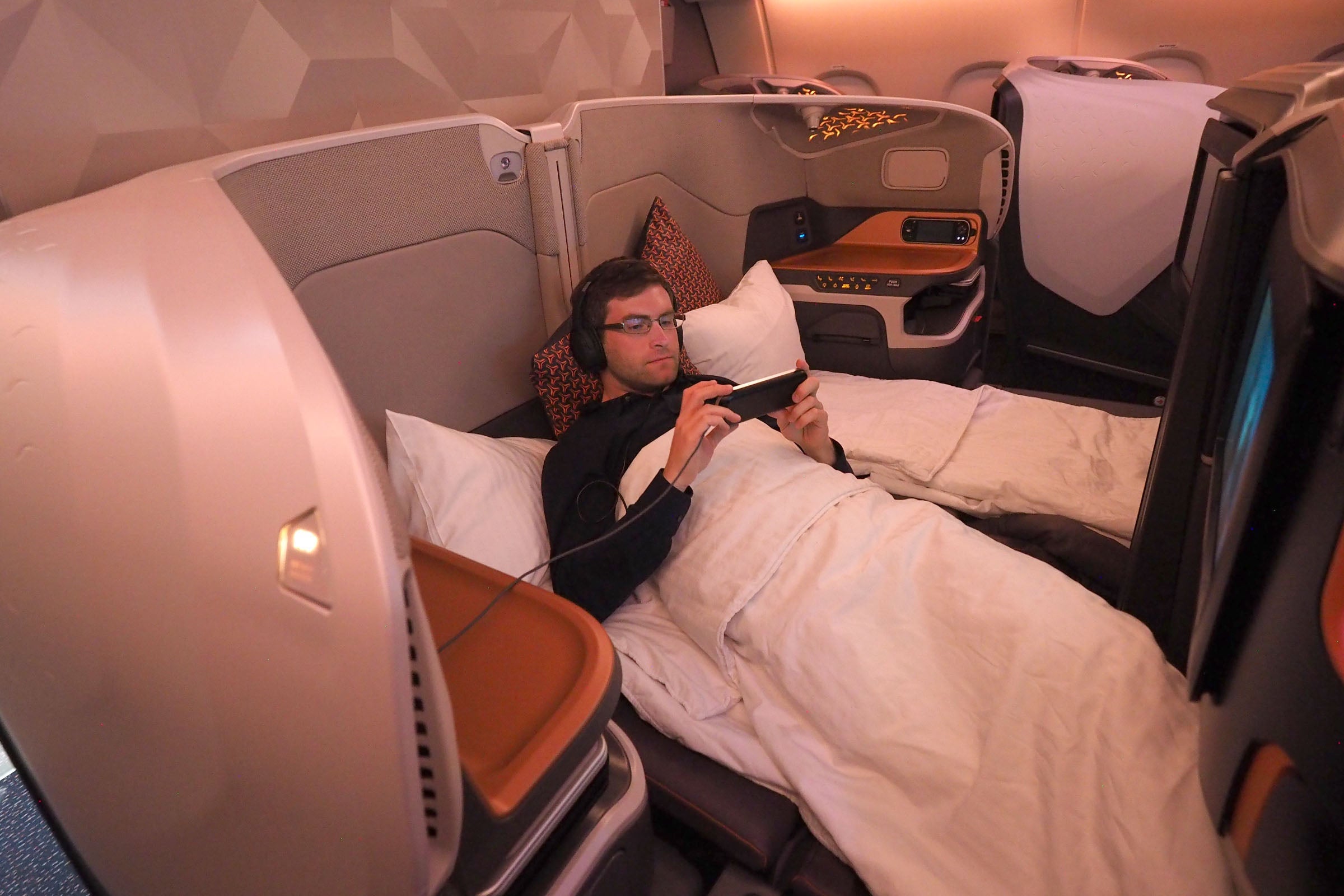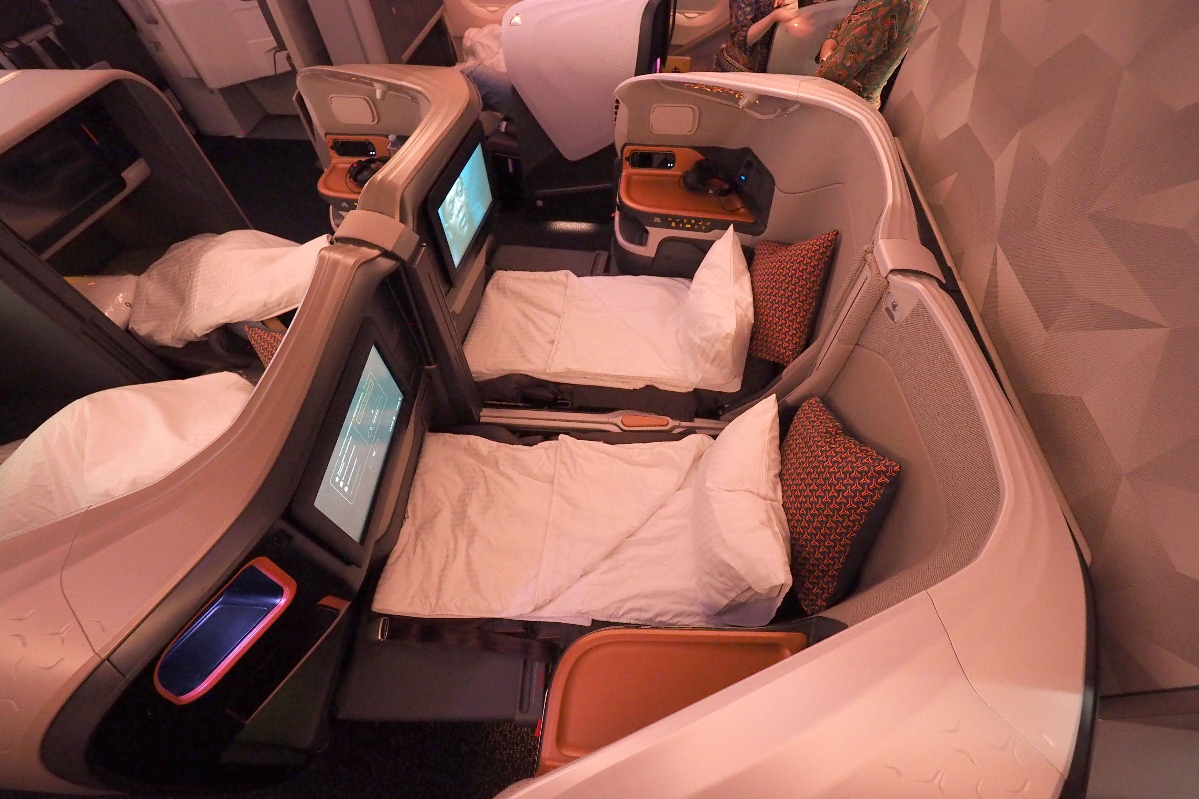 While the new A380 Singapore Suites justifiably got a lot of attention, Singapore also improved its A380 business class cabin. One of the improvements: the ability to fully drop the middle seat divider to create a quasi-double bed.