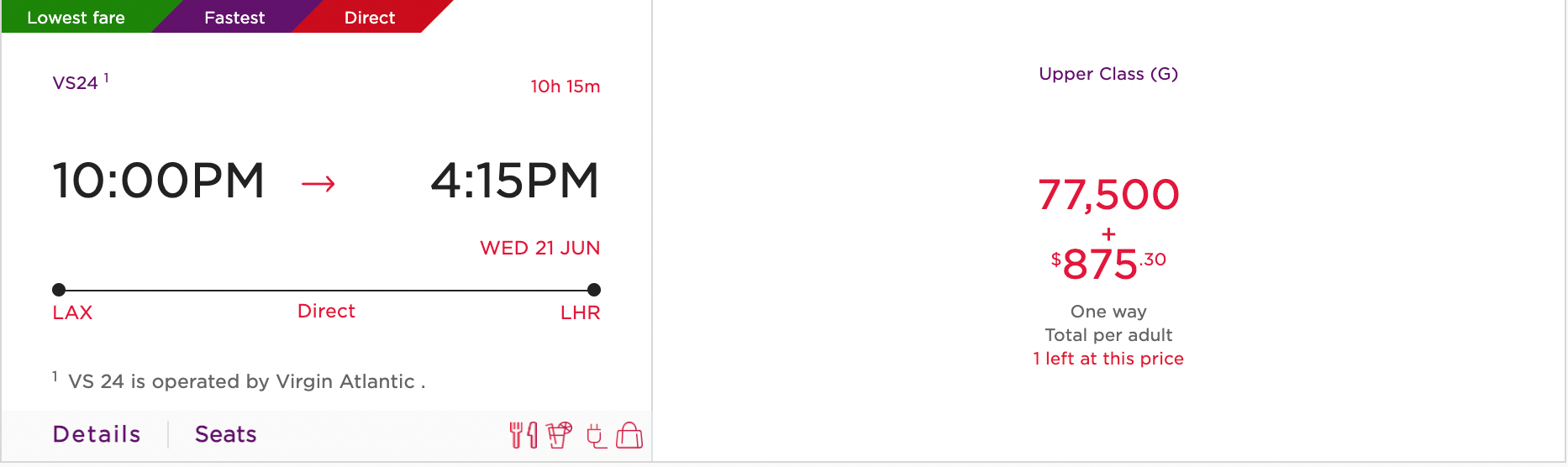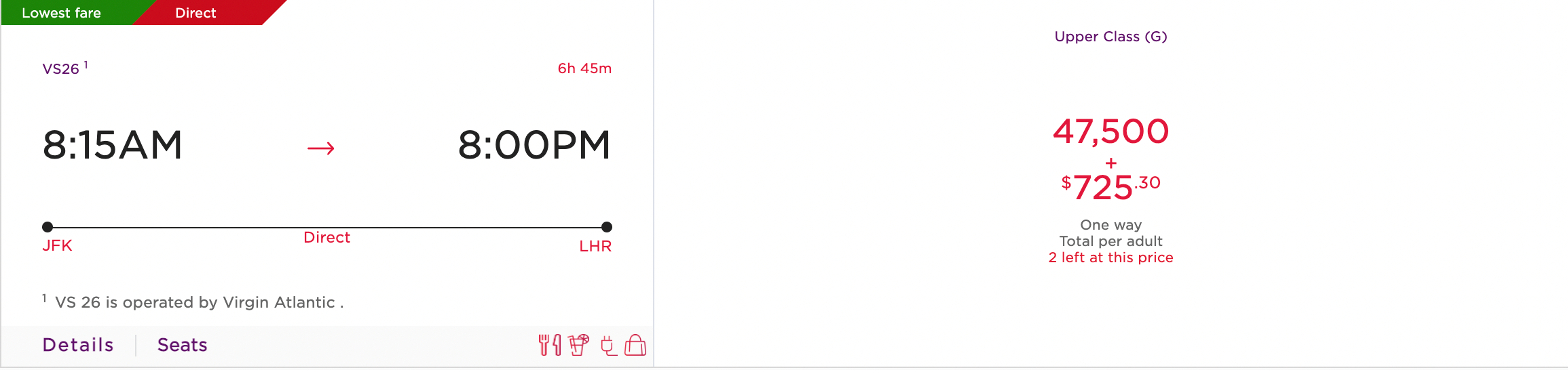 Although you may be tempted to use your Virgin Atlantic Flying Club points, there is a better way to book these seats. Virgin will charge you 47,5000 points and an outrageous $700-plus in taxes and fees. It is even worse from the West Coast.
