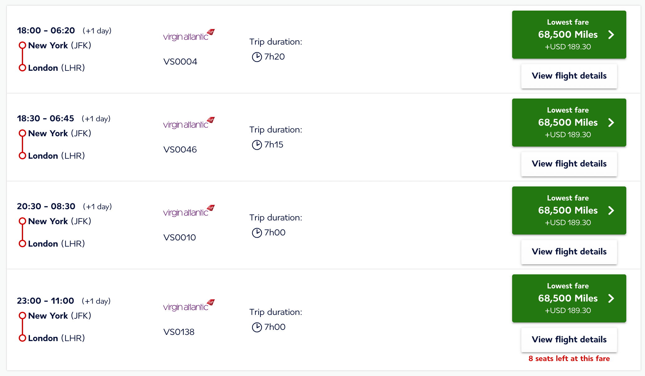 I was able to find numerous flights priced at 8,500 Virgin Atlantic points.