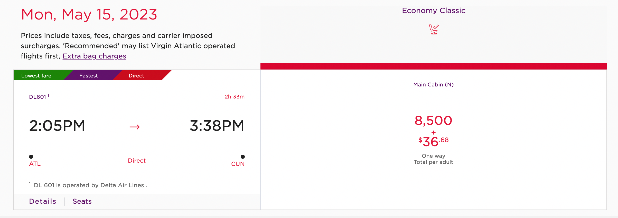 Virgin Atlantic's program recently changed to a distance-based award chart specifically for Delta flights. Most flights from the U.S. now cost between 7,500 and 15,000 points one-way in economy.