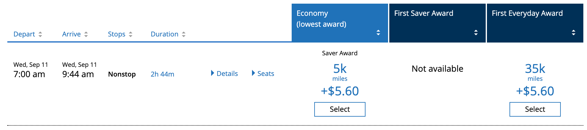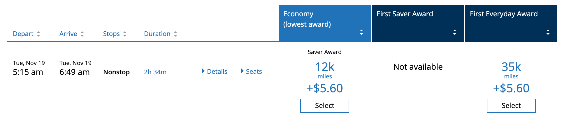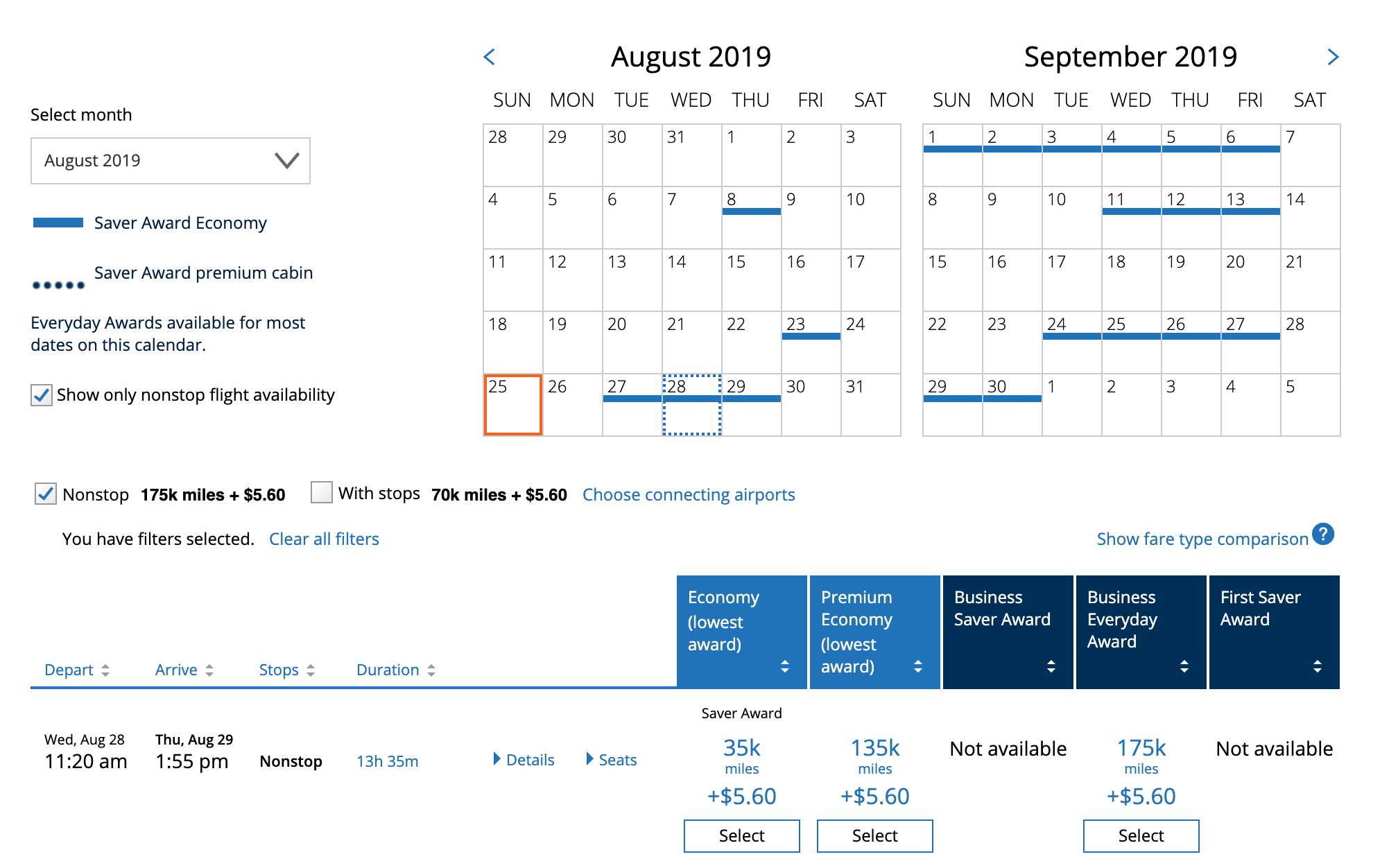 In the above example, you can easily see the difference between business saver and business everyday awards, since each one has its own column. Economy is a bit more confusing. Even though this date shows up on the calendar as having economy saver space, the column is titled "Economy (lowest award)" which is the same thing you'll see on dates that don't have saver space.
