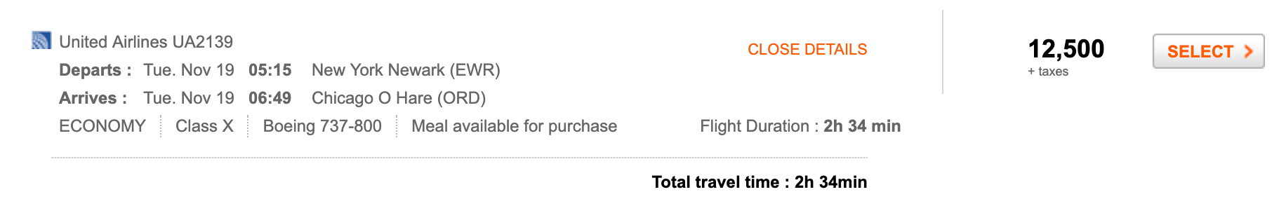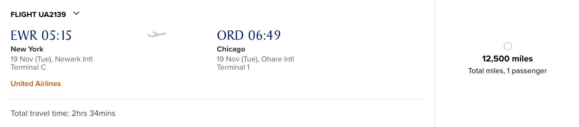 Thankfully, it appears (for now) that United is still using the "Saver Award" designation on tickets that price lower than the normal prices from the soon-to-disappear award charts. For example, the first flight of the day from Newark to Chicago-O'Hare (ORD) on Tuesday November 19 is pricing at 12,000 miles, a slight discount off the usual 12,500-mile rate for a one-way economy award within the US.