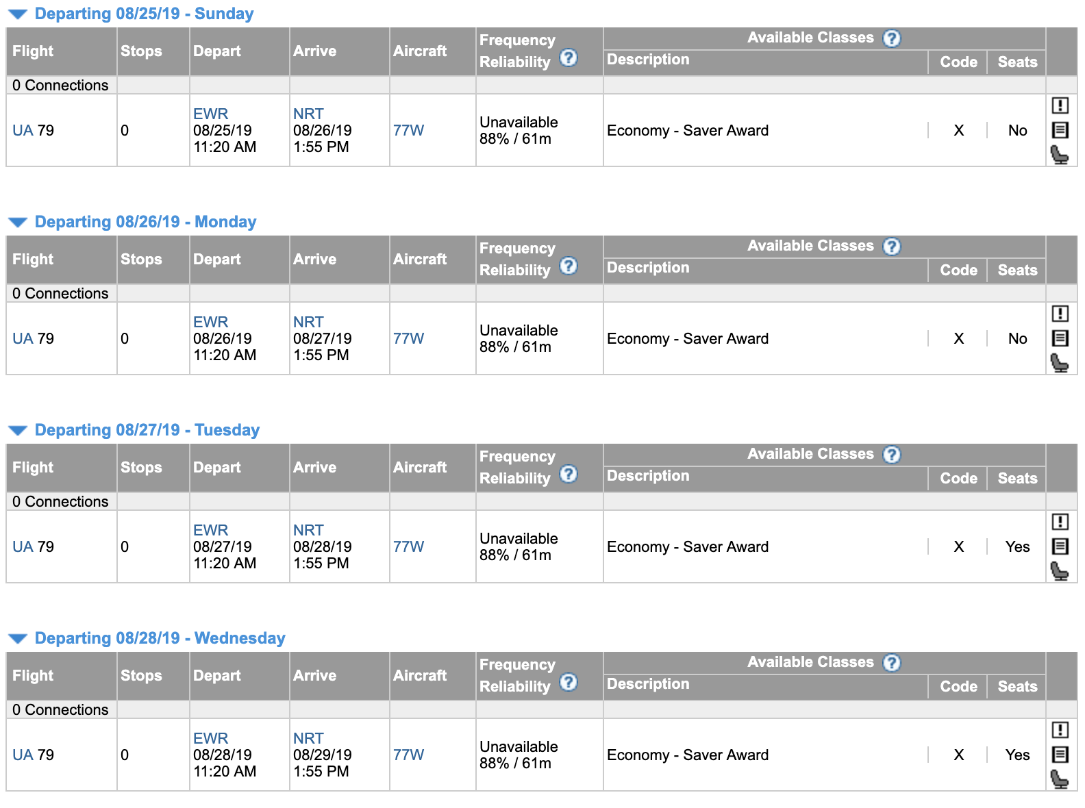 Another good fallback option is to use ExpertFlyer, which will only search for saver level award space (unless you override its default settings by inputting a different fare code). If you're planning to book through a partner program instead of directly through United, it might even make sense to start here to avoid confusion. On the EWR-NRT route, ExpertFlyer perfectly matches the United website with no saver level economy award space on August 25th or 26th, but seats available on the 27th and 28th.