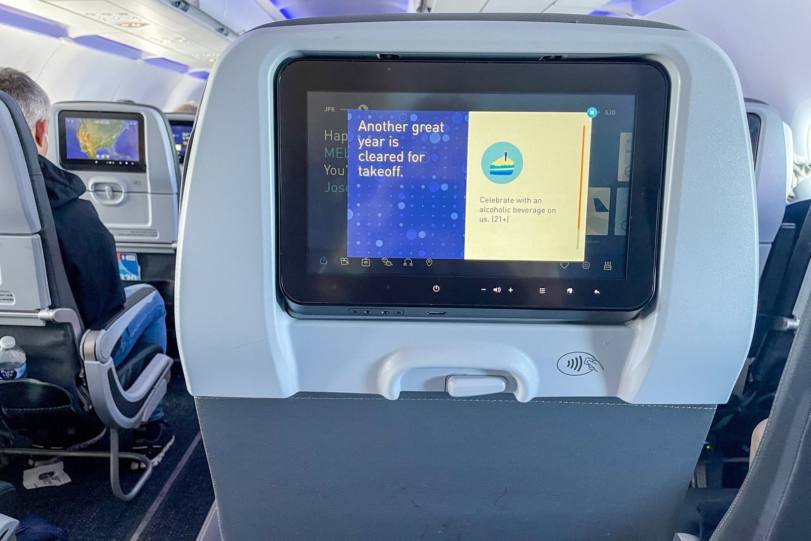 My devotion to EWR and, therefore, to United, means I rarely find myself flying other airlines, and it had been more than a year since the last time I boarded a JetBlue flight. But when I arrived at my seat to find a series of messages on the seatback screen wishing me a happy birthday and promising a complimentary alcoholic beverage, I felt almost like I had Mosaic status.