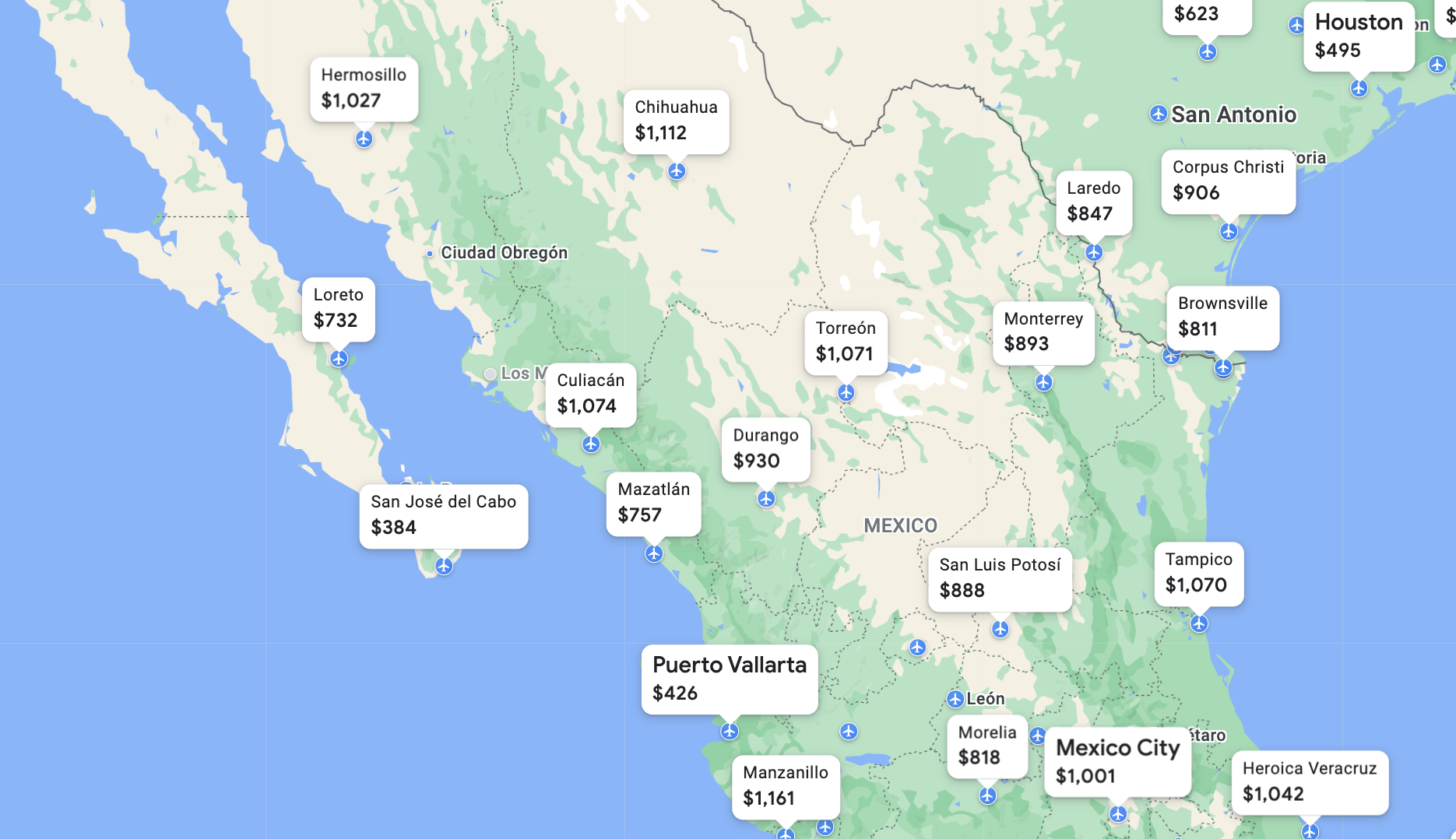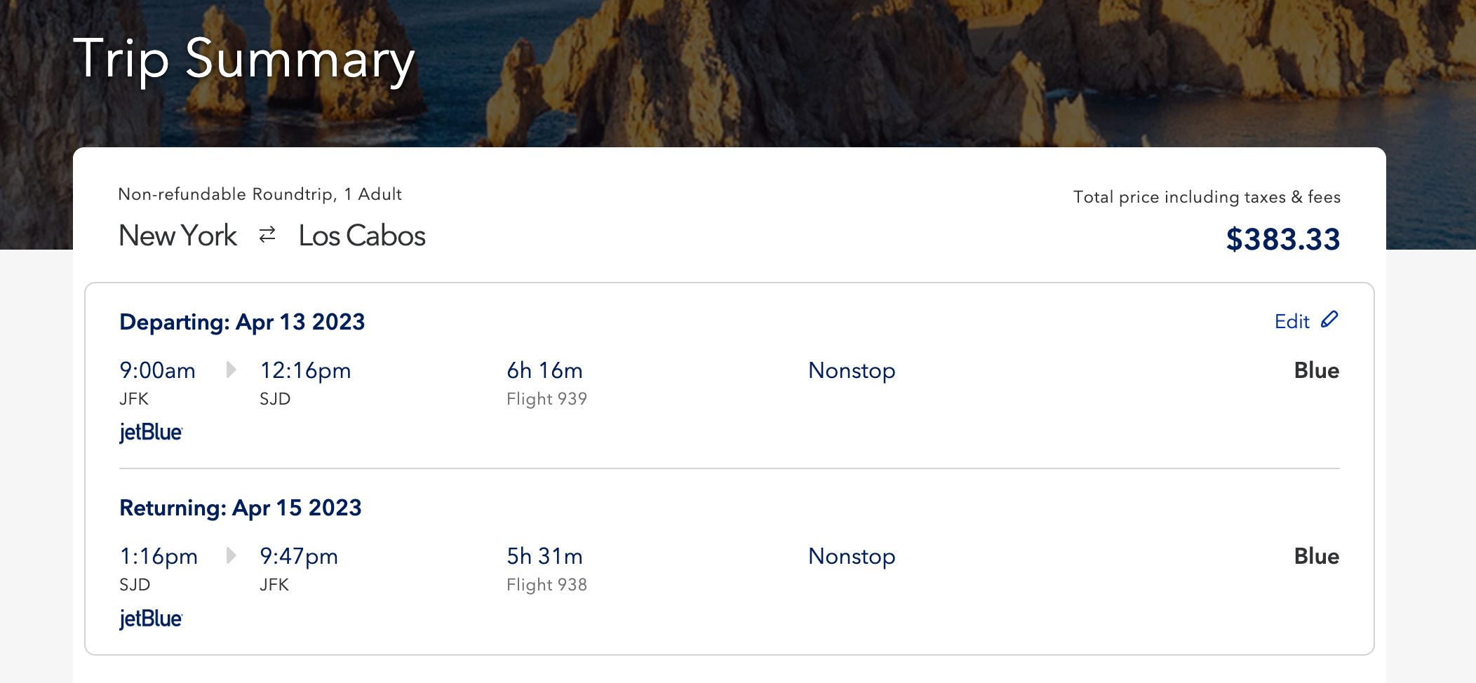 By the morning of my birthday, I found the cheapest round-trip flight out of the country after zooming in on the Baja Peninsula. There was a $383 round-trip fare with JetBlue departing from New York-JFK for Los Cabos (SJD) at 9 a.m.