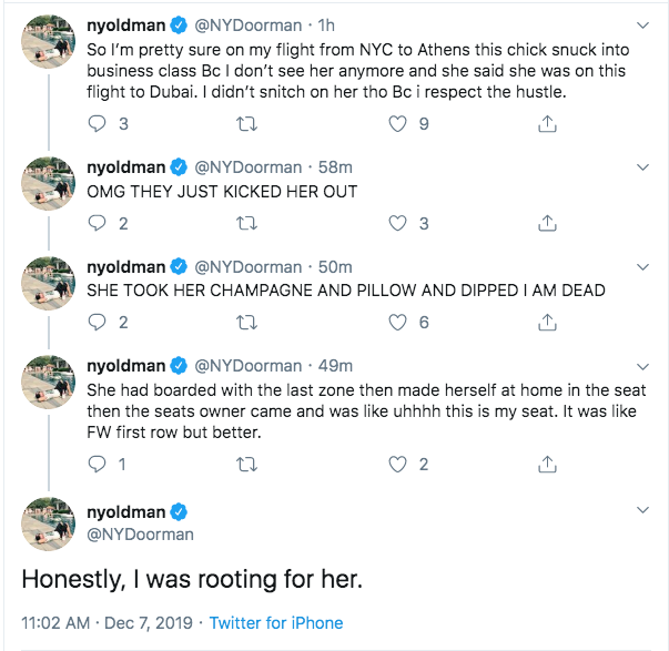On Dec. 7, 2019, Twitter user @NYDoorman started a thread on social media after he witnessed a woman self-upgrade to business on an Emirates flight from Newark to Dubai, connecting in Athens.