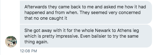 TPG reached out to @NYDoorman who says that, shockingly, the self-upgrade technique worked throughout the entire Newark to Athens leg. The passenger was only "caught" when she tried the same approach on the Athens to Dubai leg. (TPG has reached out to Emirates for comment.)