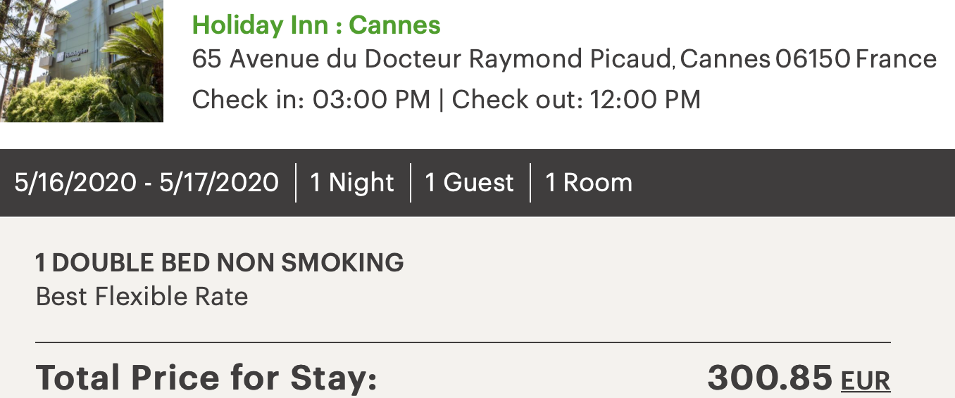 That's expensive, but within reach if you have the IHG Rewards Premier Credit Card, with its sign-up bonus of 125,000 bonus points plus a Reward Night after spending $3,000 on purchases within the first three months of account opening. Of course, the point of this is to be fancy and cheap, which instead leads us to the Holiday Inn Cannes, which costs 30,000 points per night.