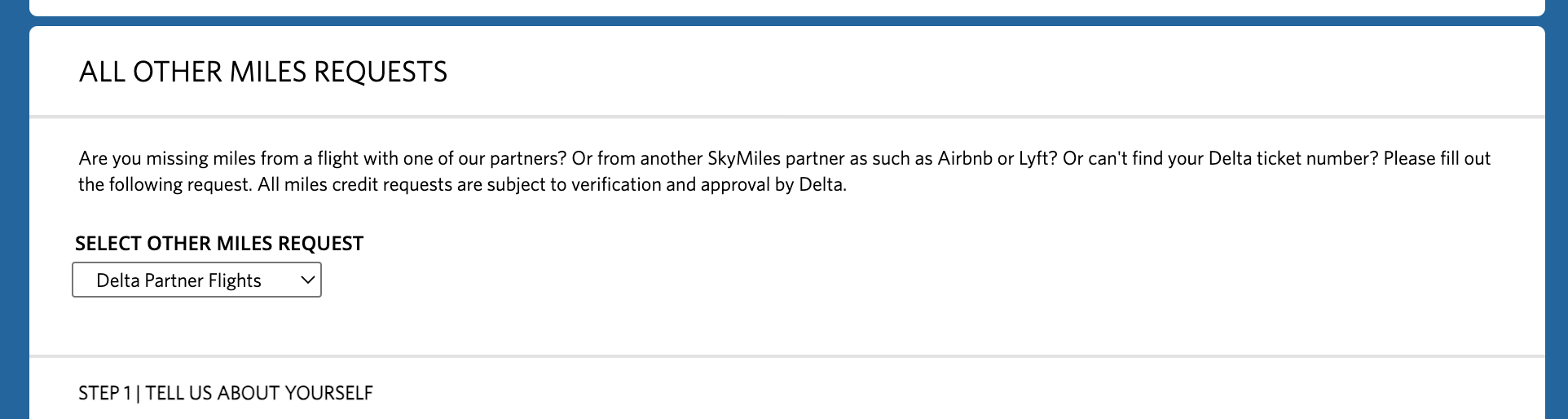The process for requesting missing miles for partners is similar to requesting them for Delta flights. Follow the steps discussed above to get to the "Request Mileage Credit" page. Then, fill out the form at the bottom of the page.