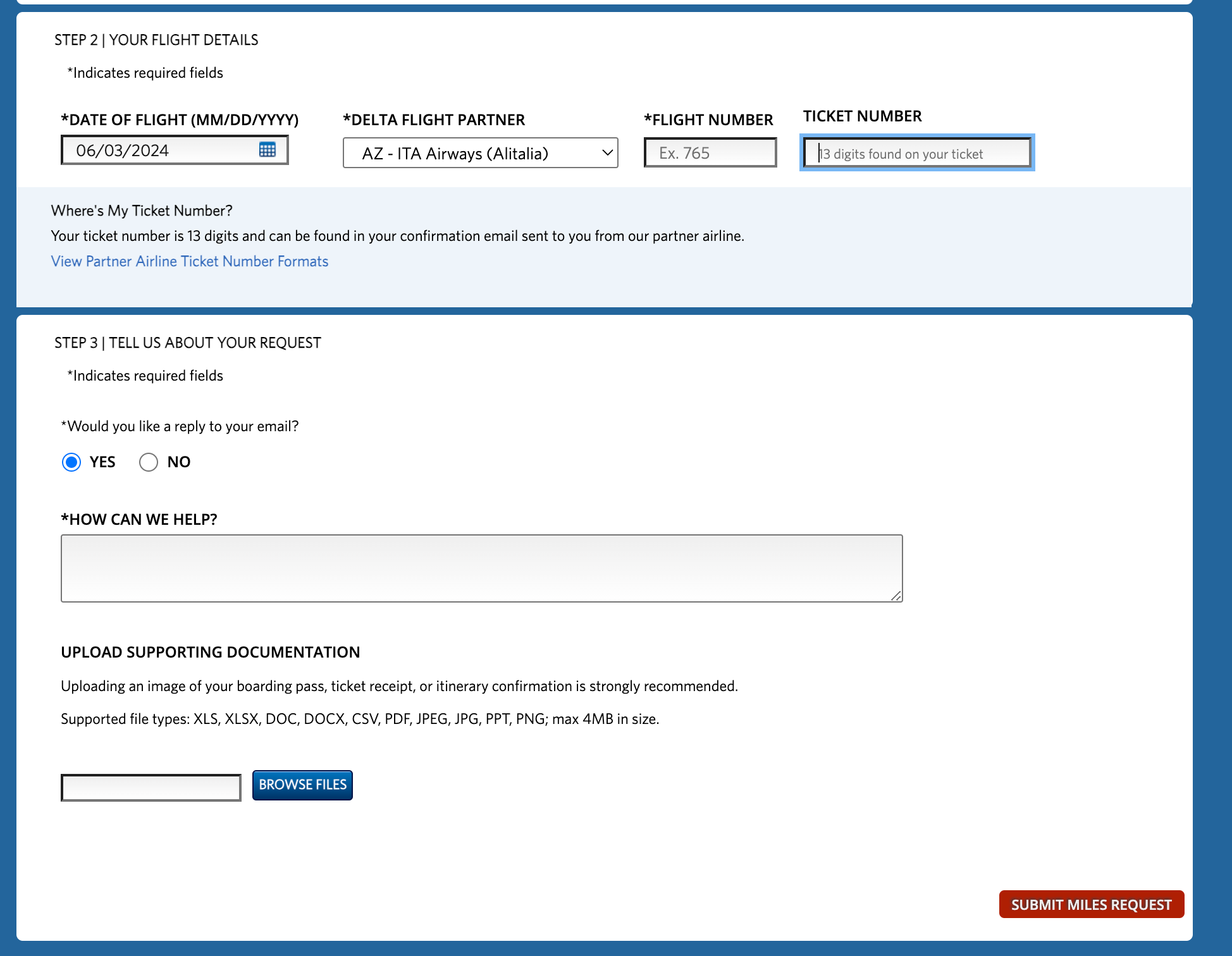 Delta strongly recommends uploading supporting documentation, such as a boarding pass, ticket receipt or itinerary confirmation, in this form.
