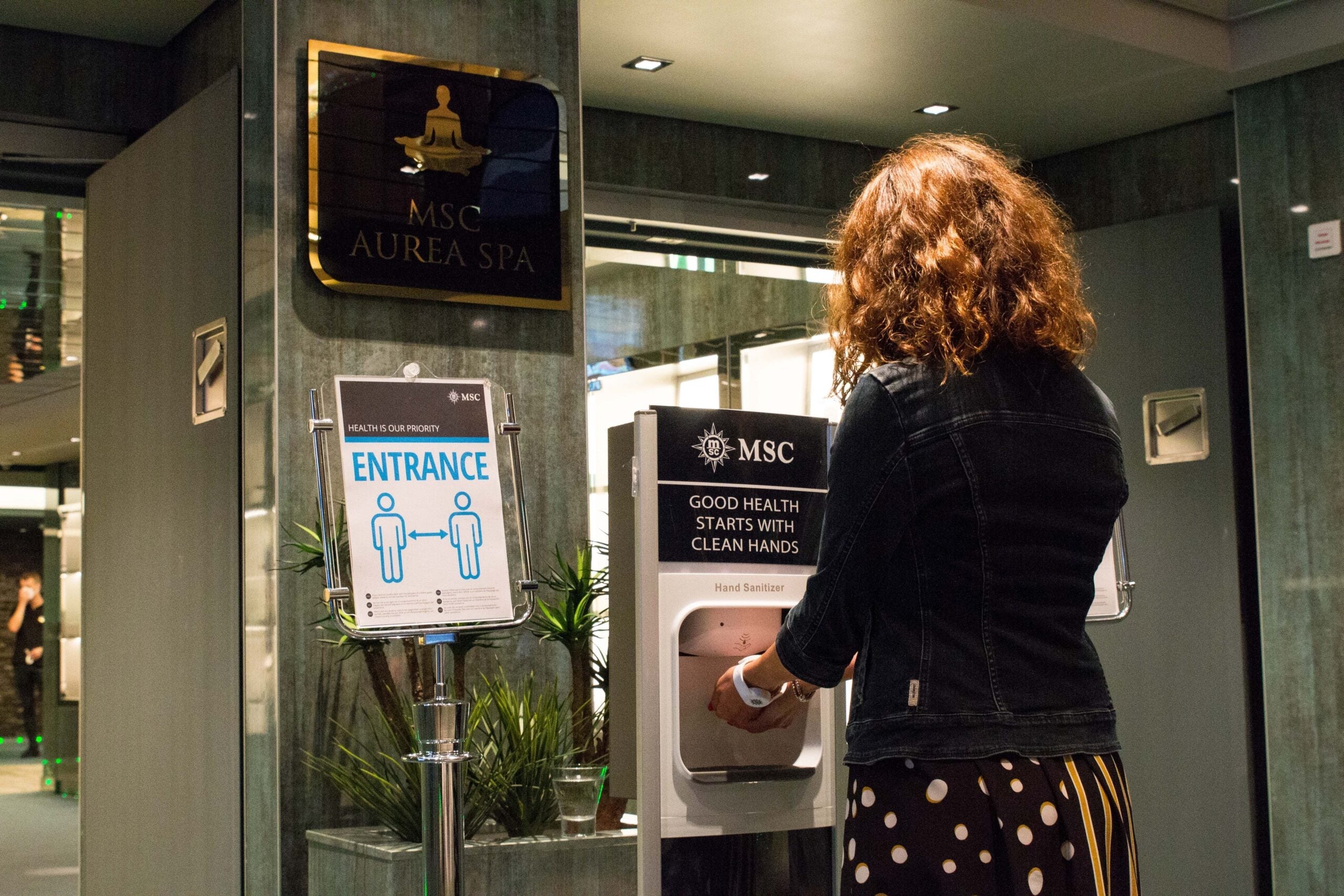 A new sanitation station on the MSC Cruises ship MSC Grandiosa. The ship resumed sailing in Europe in August. (Photo courtesy of MSC Cruises)