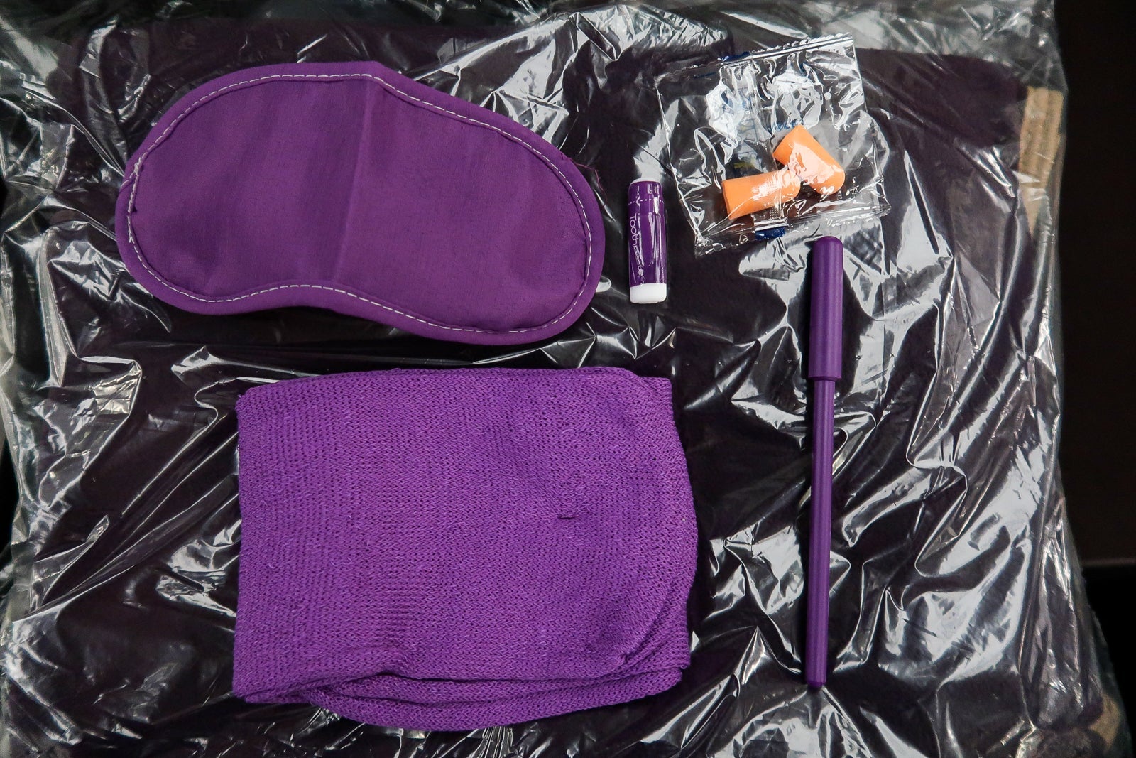 You'll usually be provided with a small pillow blanket and cheap headphones in regular economy class. You'll receive the same in premium economy although they will be slightly bigger and better quality. You will receive a small, basic amenity kit in premium economy with Virgin and British Airways, which you can expect to contain the following: