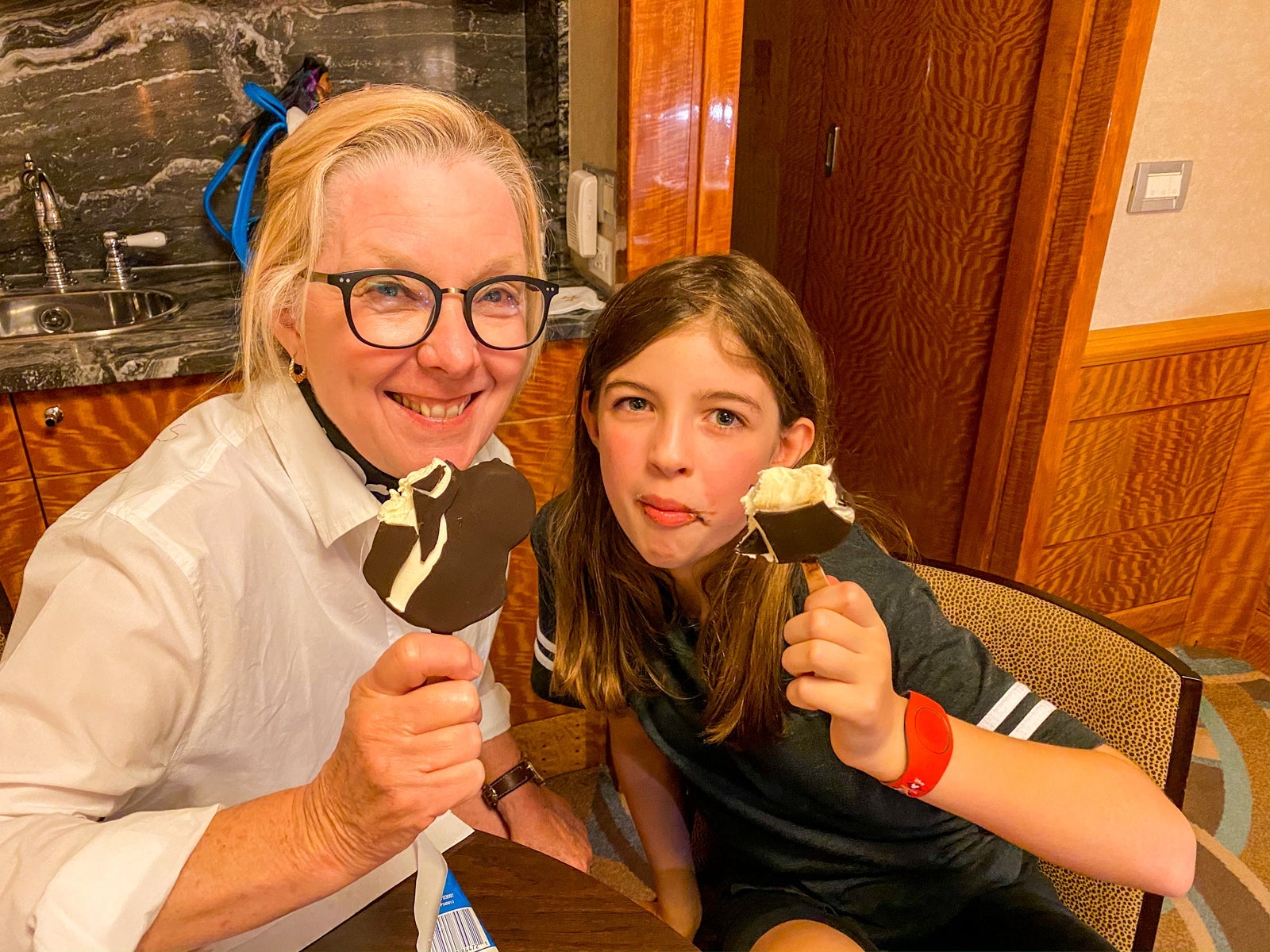 I'm a fan of ordering room service for a quick breakfast (or that first hit of coffee) or for a fun anytime treat of Mickey ice cream bars. I often order Uncrustables from room service the night before port days to toss in my bag for the family to eat while ashore. My girls learned how to politely call to order these by the second or third day of the cruise.