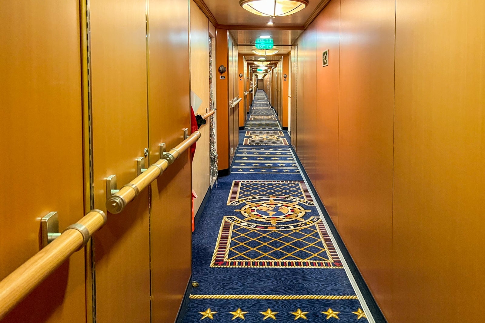 It can be disorienting at first to find your way around a cruise ship, but Disney makes it easy to know if you are heading forward or aft when you're in the long cabin hallways. If the carpet design is upside down, you're heading toward the back of the ship, but if it is right side up, you're heading to the front of the ship. In the photo below, the globe is the clue.