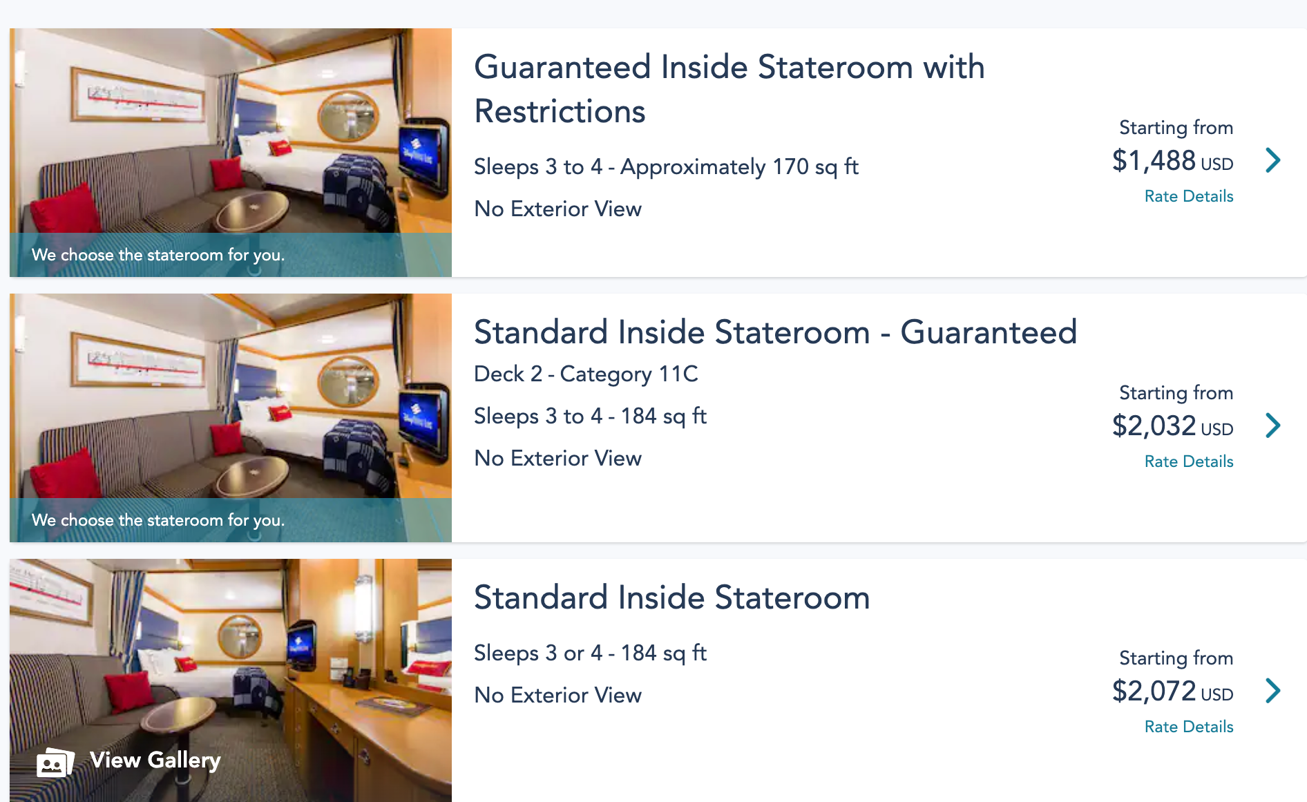 In the example below, you'll see the cheapest inside cabin where you pick a specific room on the ship is $2,072, while the price starts at $1,488 if you let Disney choose which inside room you get. This type of fare comes with additional restrictions, so read the fine print carefully. I've done this multiple times and have always been happy with the room location I've received.