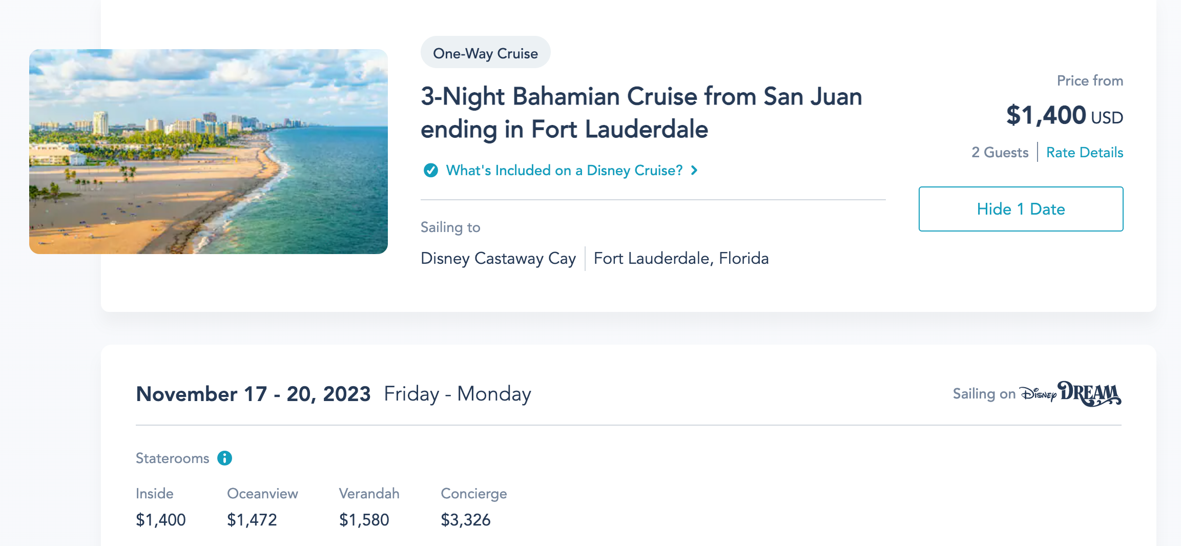 For example, Disney Dream will sail a three-night cruise to move it from San Juan to Ft. Lauderdale in November. You can book a cabin with a balcony for $1,580 for two people, which is a solid price on Disney Dream. The $3,326 price tag for a concierge-level cabin is very good; those cabins usually start at close to $800 to $1,000 higher on many other three-night sailings.