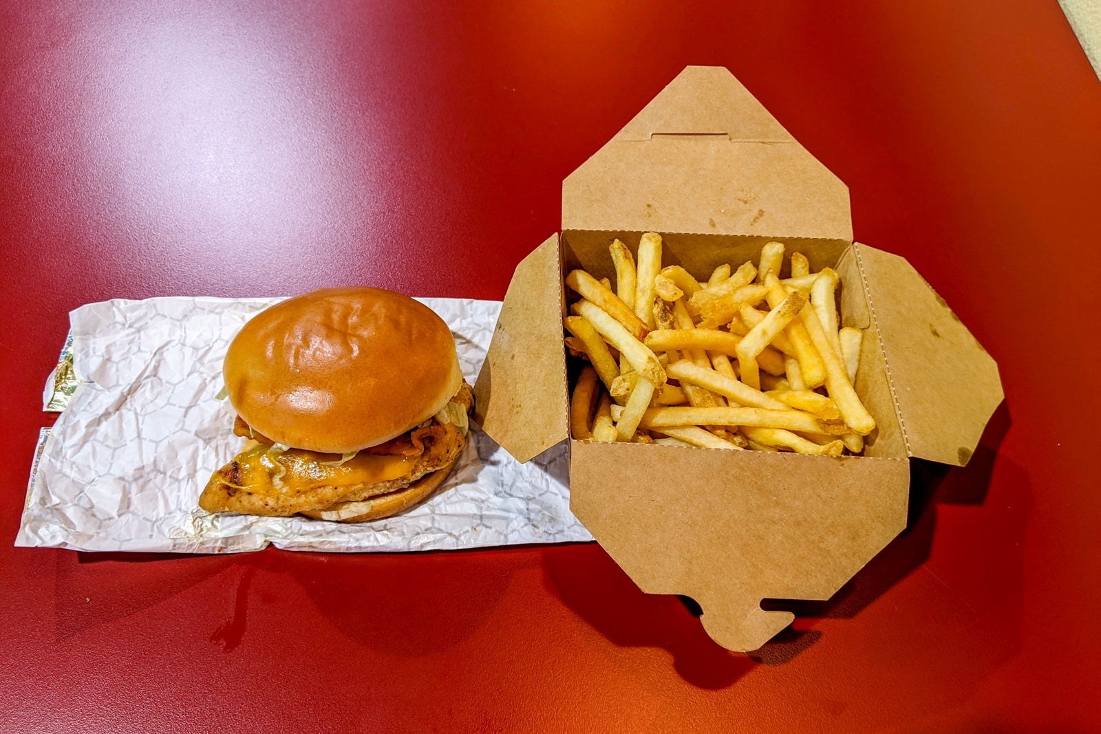 - Dinner at World Premiere Food Court: House-seasoned grilled chicken sandwich and fries for $12.83.