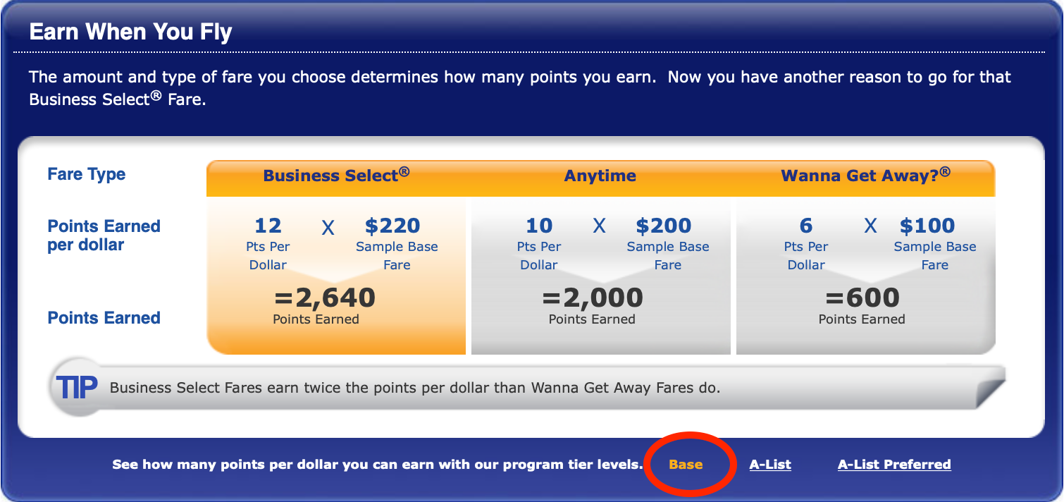 Base Rapid Rewards members earn 6 points per dollar spent on the lowest "Wanna Get Away?" fares, 10 points per dollar for Anytime fares and 12 points per dollar for Business Select fares. However, those points are multiplied when you're a Southwest elite, which can really add up if you travel on the airline regularly, as shown below.