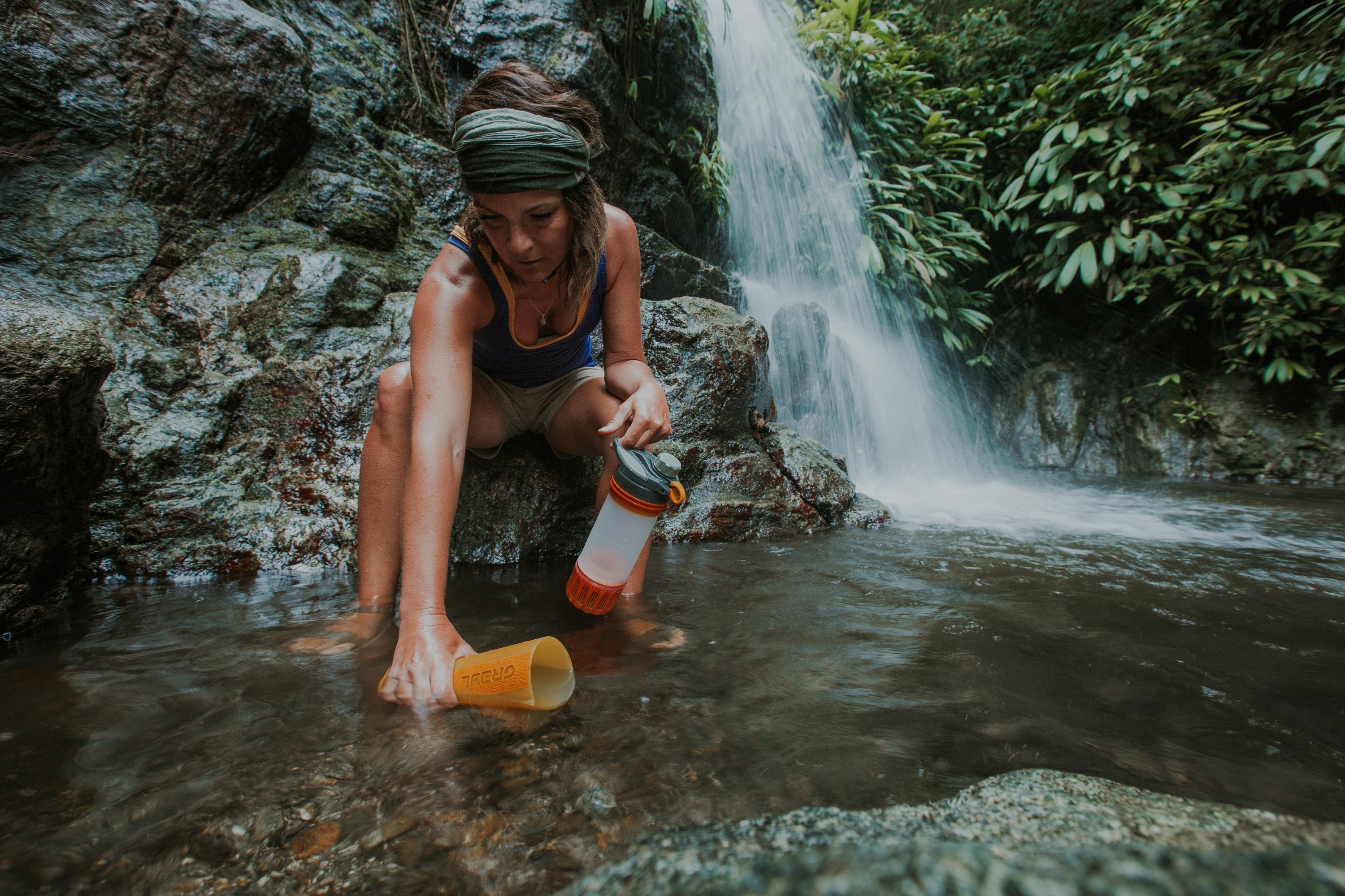 My favorite option for safely drinking water while traveling is the GRAYL Water Purifier Bottle, because it's a stand-alone unit. To use it, fill the outside chamber with water, then push the inside chamber into the bottle. The water purifies as it passes through the filter at the bottom of the inner chamber. It's my primary water bottle, even when the water is already clean, so it doesn't require me to travel with anything more than I'd already have.