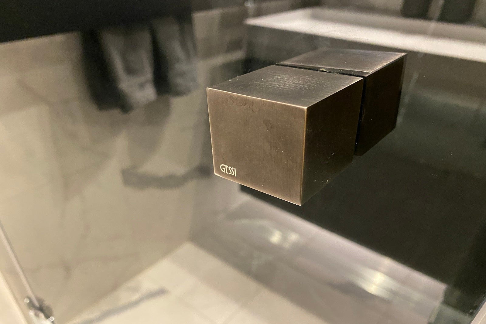 Oddly, the cube-shaped pewter handle on the shower makes it difficult to open said door, as it provides no grip and hurts if you hold it a certain way. To get in the shower, I had to grab the top of the door and pull to get it open.