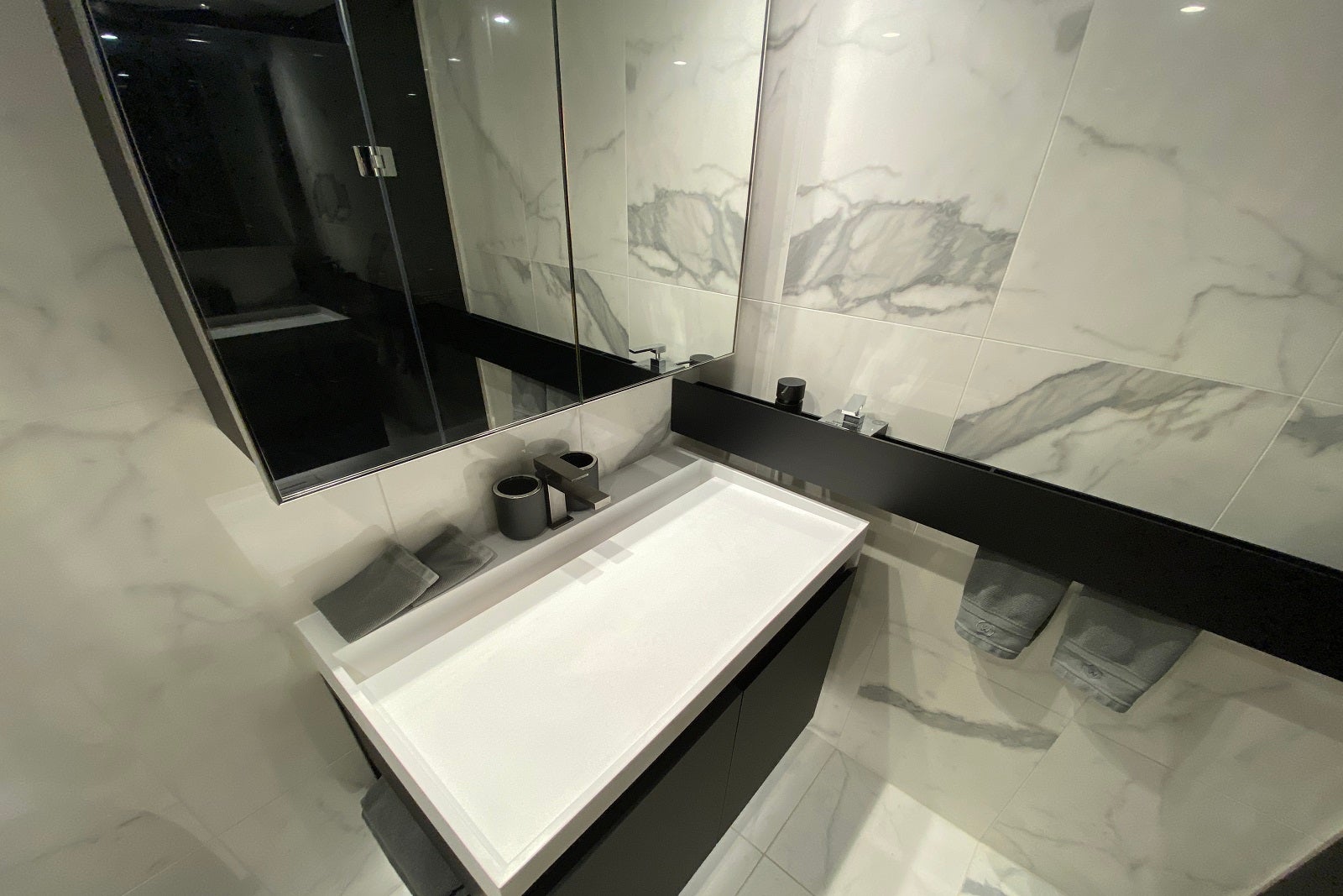 The first is the bathroom sink. The entirety of the top is a slope down which the water flows to a trough at the bottom. There is absolutely no counter space, which is particularly frustrating for anyone trying to do their hair or put on makeup, or for men who like to shave by filling up the sink basin.