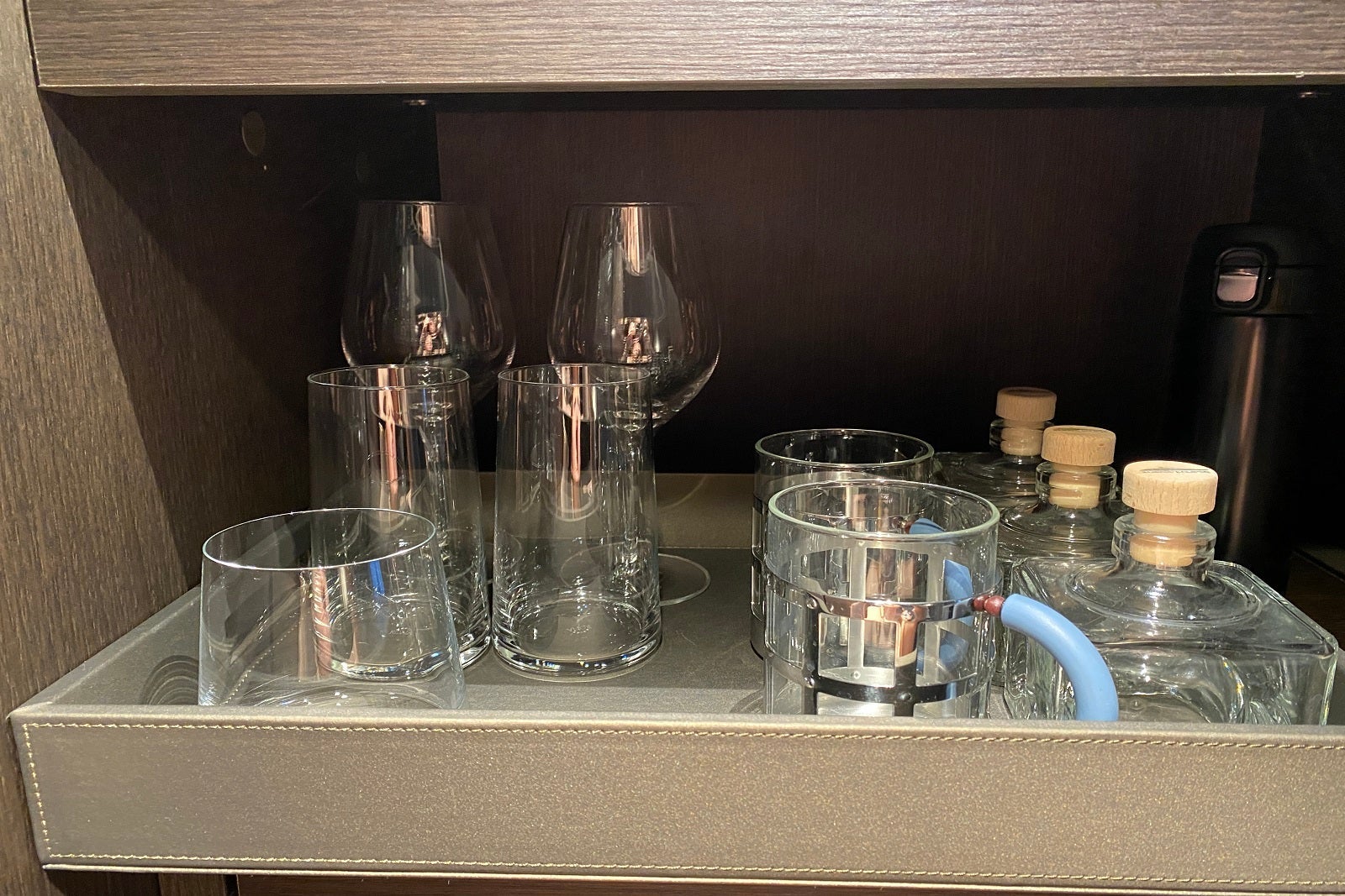 I'm not a big drinker, but with just about all onboard beverages included, it was nice to see a minifridge stocked with soda, beer and other libations. There was also a decanter set that could've been filled with my favorite liquors, had I asked for them. Carafes of water, replenished as they ran low, rounded out the choices.