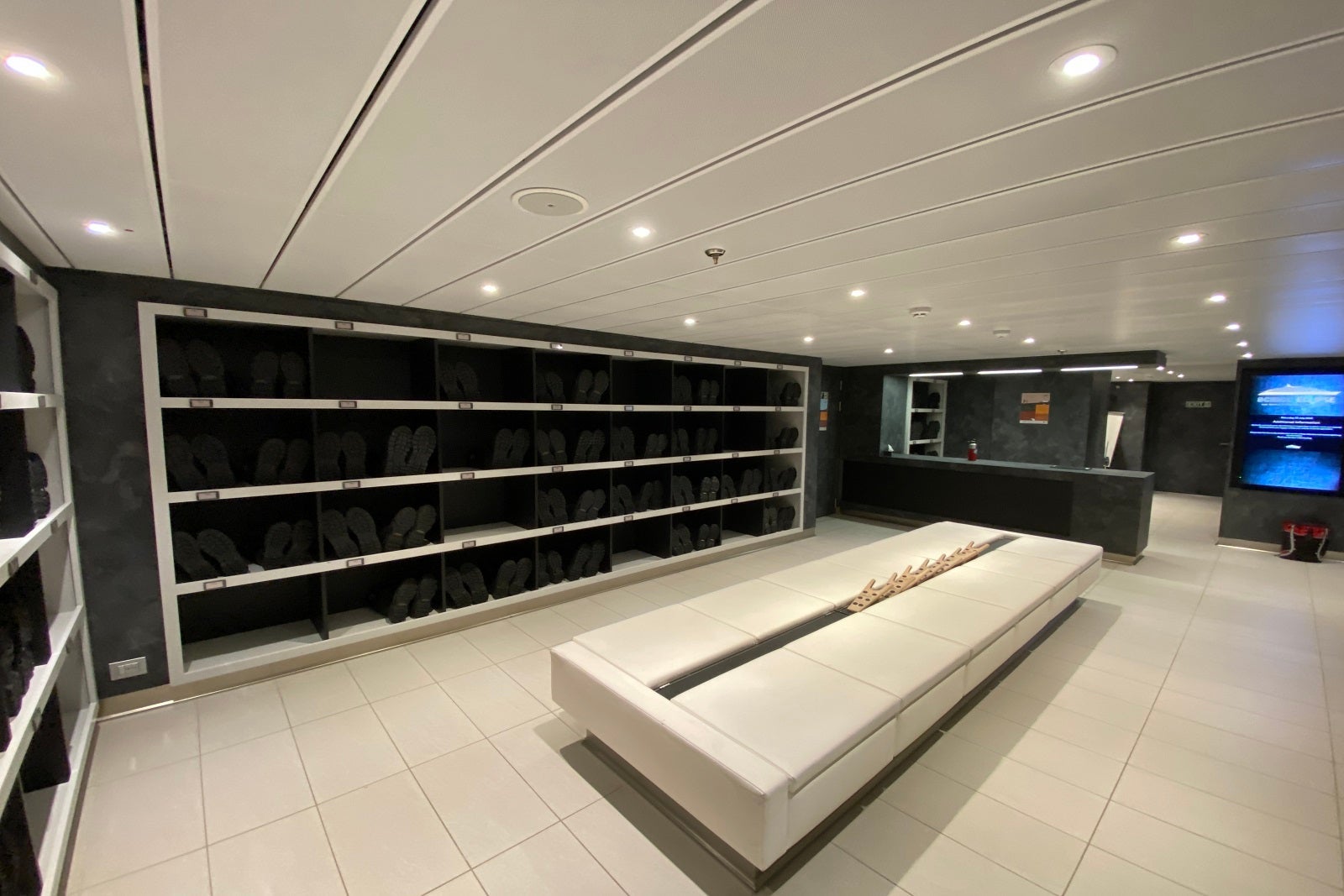 Mudrooms are standard on expedition ships. However, I was surprised by how Scenic Eclipse made this mundane room feel fancy with its leather seating, simple-but-polished design and orderly cubbies for storing Muck boots, which are provided to passengers for use during sailings.