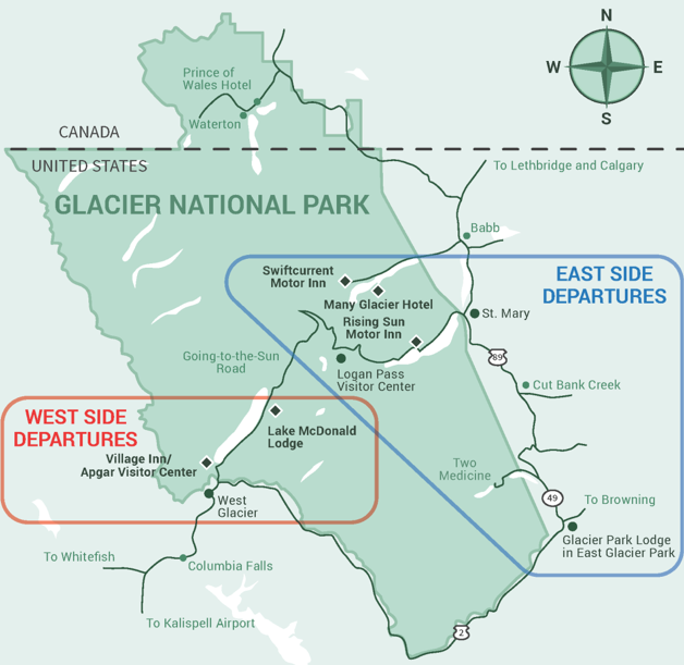 Daily service is offered from the Apgar Visitor Center in West Glacier, the Glacier Park Lodge in East Glacier, the Glacier Peaks Hotel in Browning and the St. Mary Visitor Center.