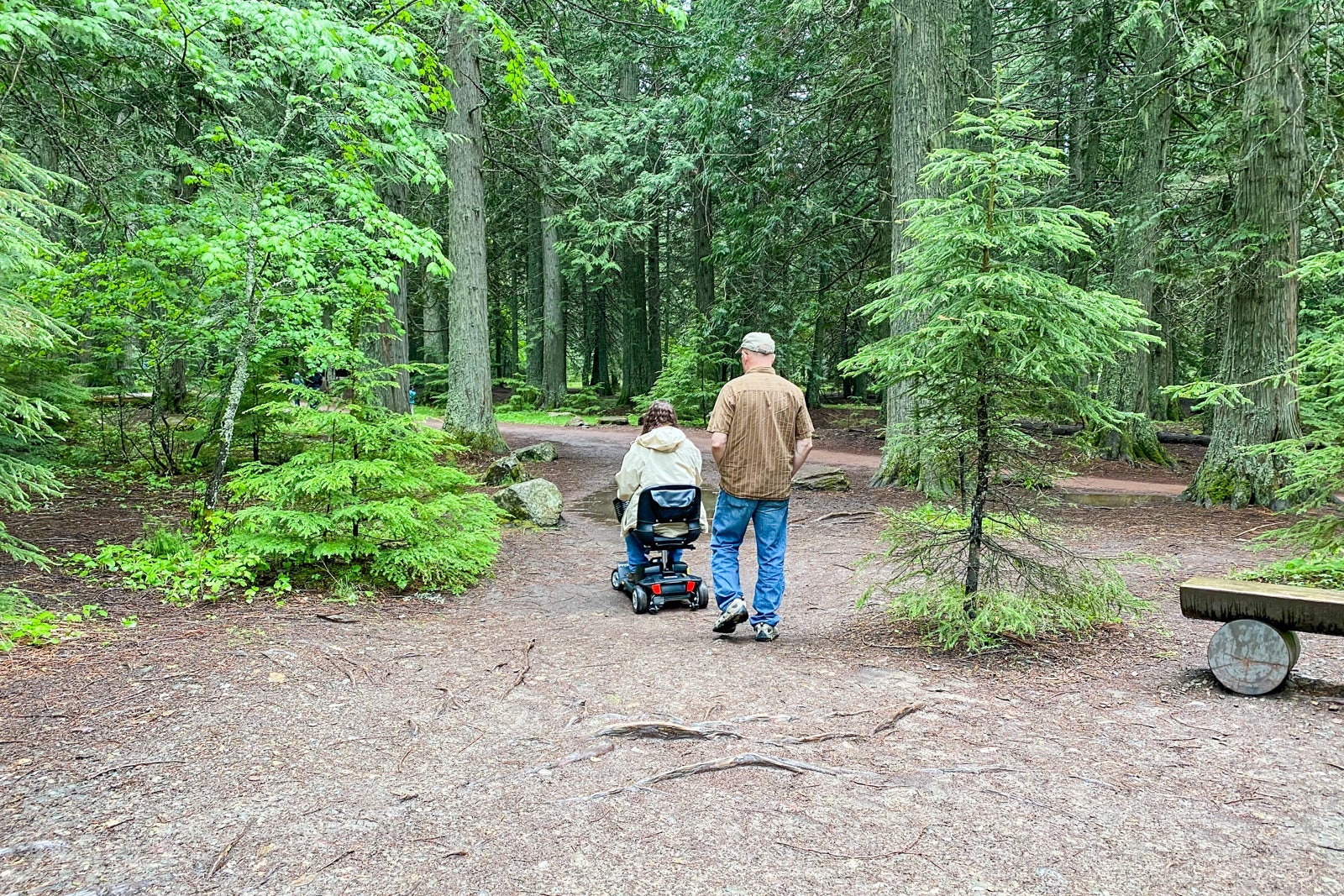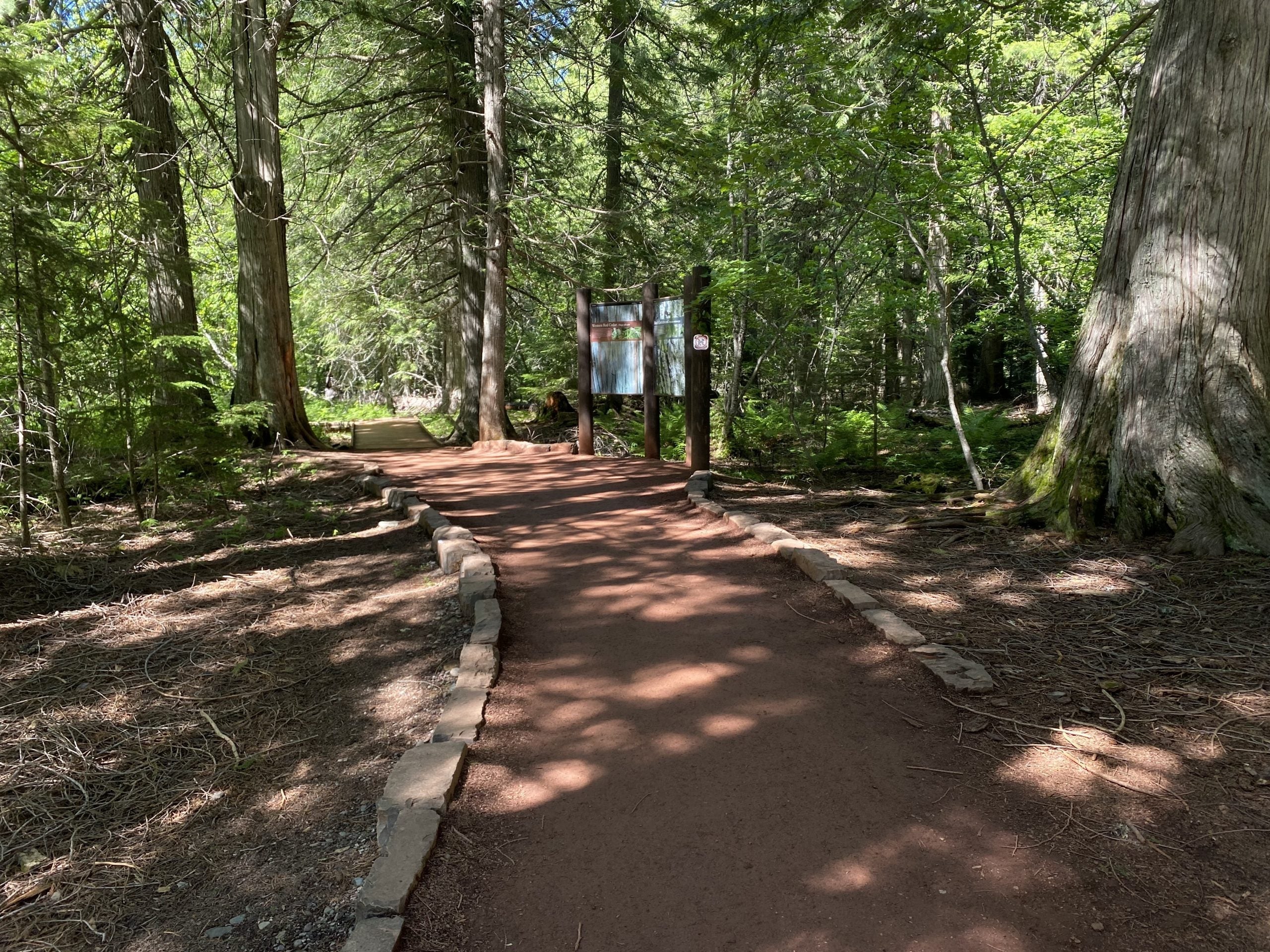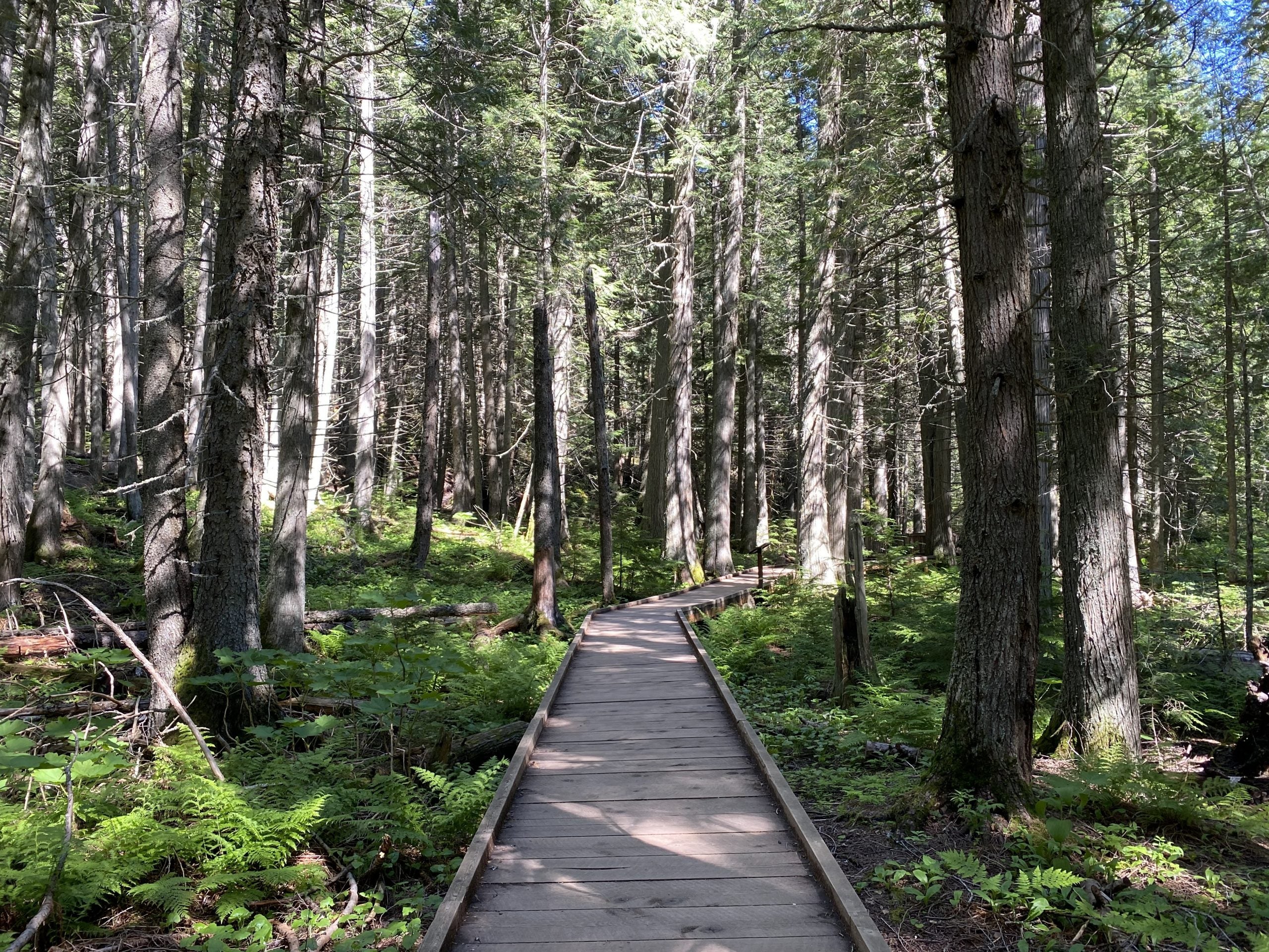 A flat, wheelchair-accessible trail in Glacier is Trail of the Cedars, which is located at the base of the trail to Avalanche Lake. This is a 1-mile loop that's perfect whether you want to push a stroller, need wheelchair access or are simply looking for an easy stroll with ample shade and seating.