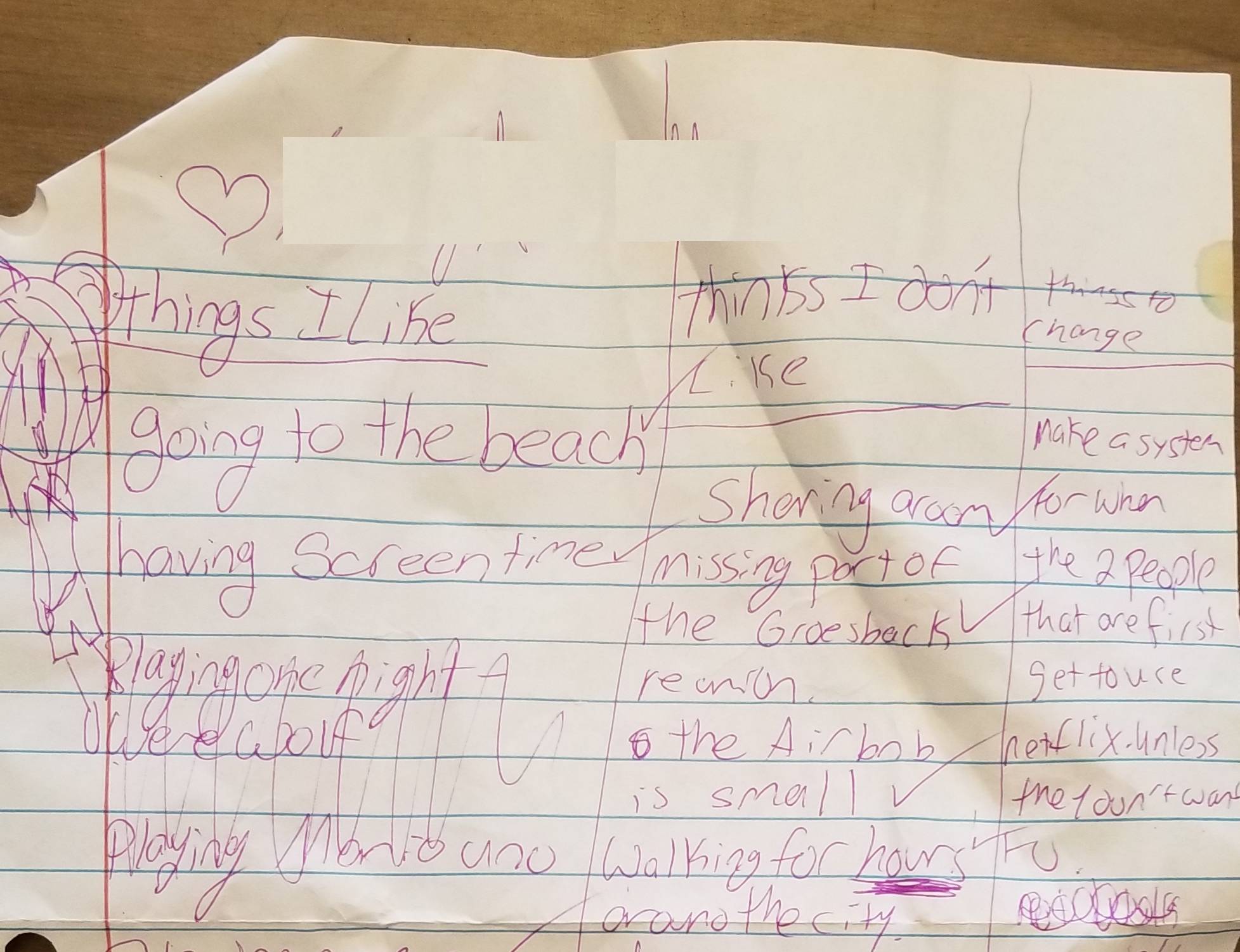 Then we started brainstorming from the third column: the list of things that we could change. There were many things on the list of dislikes that we just couldn't do anything about. This list included: