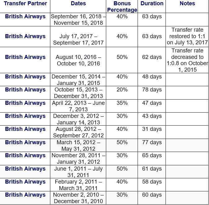 - From fall 2010 to the spring of 2015, there were 10 transfer bonus offers from Amex to BA ranging from 30–50% at a 1:1 ratio, with 60% of those bonuses offering more than Chase's initial 30% bonus offer. This was a real heyday for short-haul trips since you could still book 4,500 one-way Avios awards even within the United States.