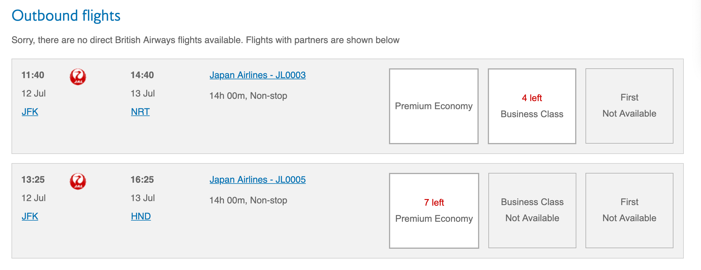 While I find British Airways' website to be rather glitchy, it unfortunately ranks as one of the best search engines for Oneworld award availability. If you plan on flying Cathay Pacific or JAL in a premium cabin, you're practically required to go through British Airways (but more on that in a moment). For all the complaints I have about British Airways, it's very nice to be able to log in and see at once that there are four business class award seats available on JAL's flight from New York-JFK to Tokyo-Narita (NRT).