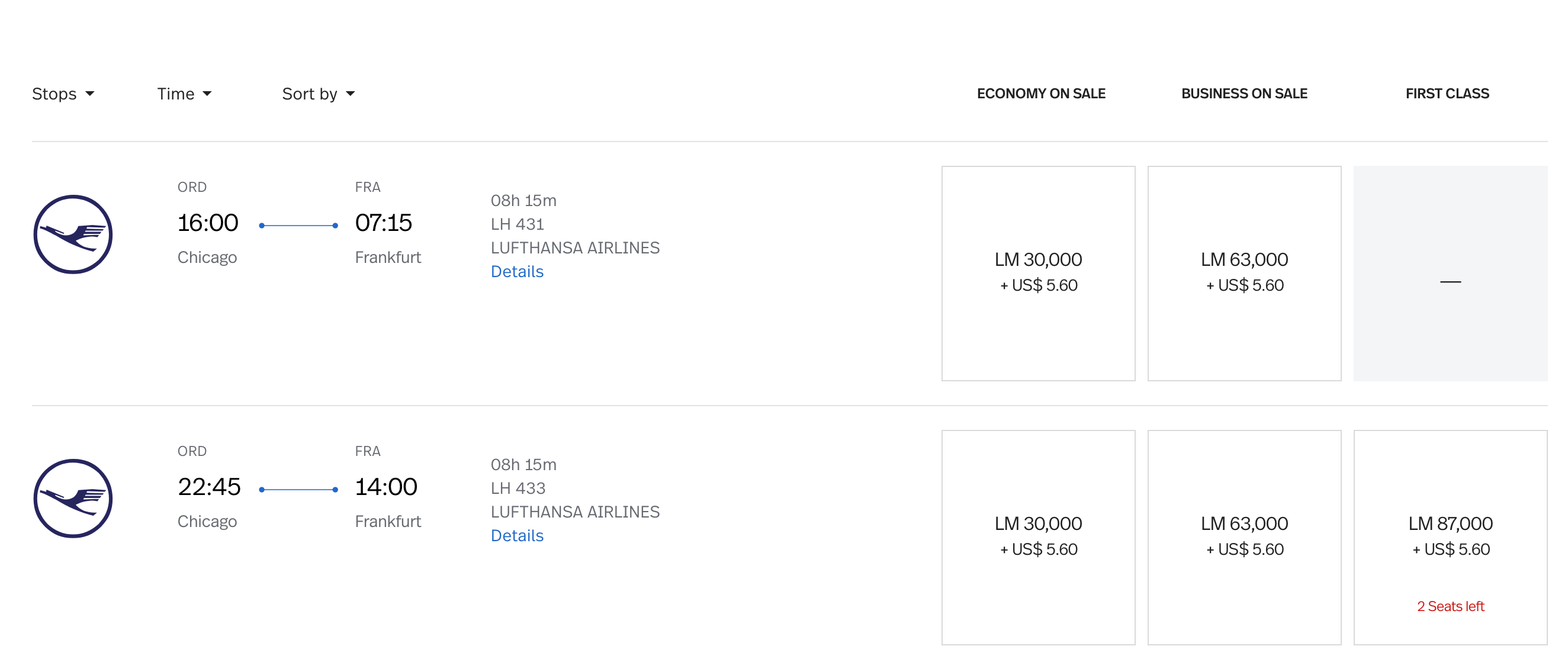 Avianca LifeMiles has quickly risen from obscurity to become one of the most popular frequent flyer programs out there thanks to low mileage rates, no fuel surcharges and a plethora of transfer options (you can transfer from American Express Membership Rewards, Citi ThankYou Rewards and Capital One to Avianca). LifeMiles doesn't always show you exactly how many awards are available on a given day, but it will give you an alert when there are only a few left. In the example below, you can see that there are only two first class awards left on Lufthansa's second daily flight from Chicago-O'Hare (ORD) to Frankfurt (FRA) — meaning you should book now instead of waiting around.