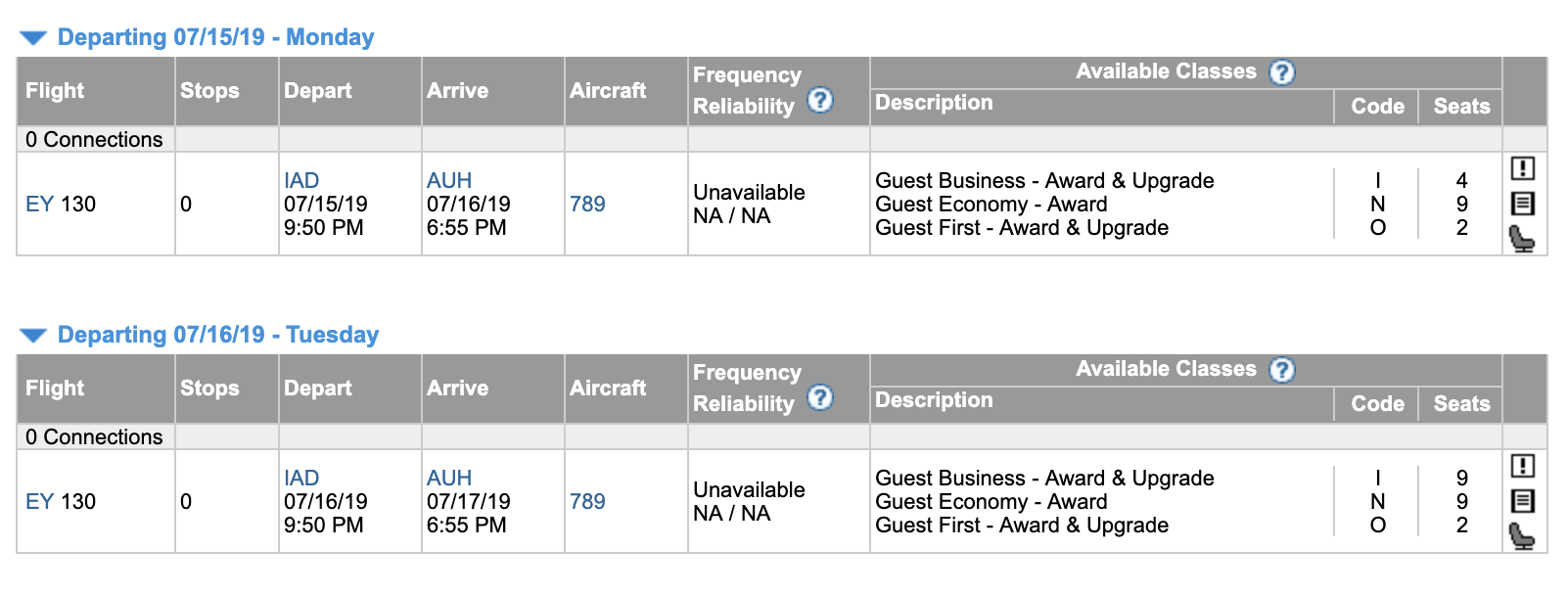 In this case, you can see how many seats are available in each cabin of Etihad's 787 Dreamliner on the flight from Washington-Dulles (IAD) to Abu Dhabi (AUH).