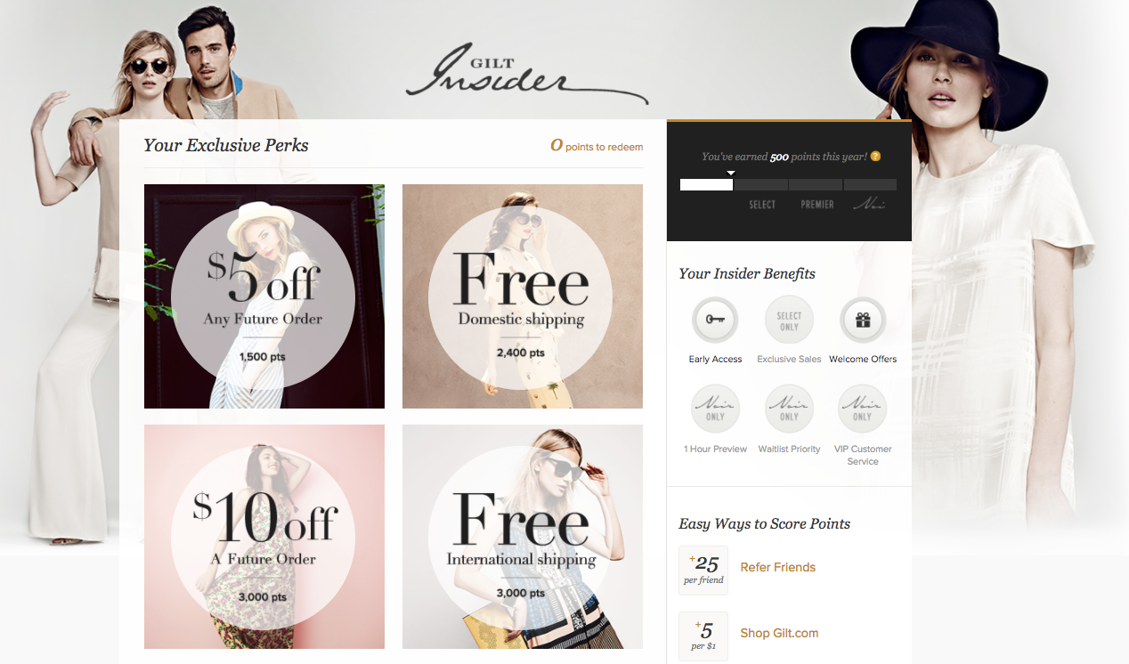 Another retailer with its own loyalty program is Gilt, an online shopping site offering insider access to designer clothing, local experiences and luxury travel. Through the Gilt Insider program, which is free to join, you'll earn 5 points per dollar spent on Gilt.com, GiltCity.com (which occasionally offers some nice mileage bonuses) or through Gilt on the Go, the site's mobile experience. You'll also receive 25 points when you refer friends to the program, and there are three elite status tiers for big spenders on the site, giving you early access to sales and additional VIP benefits.